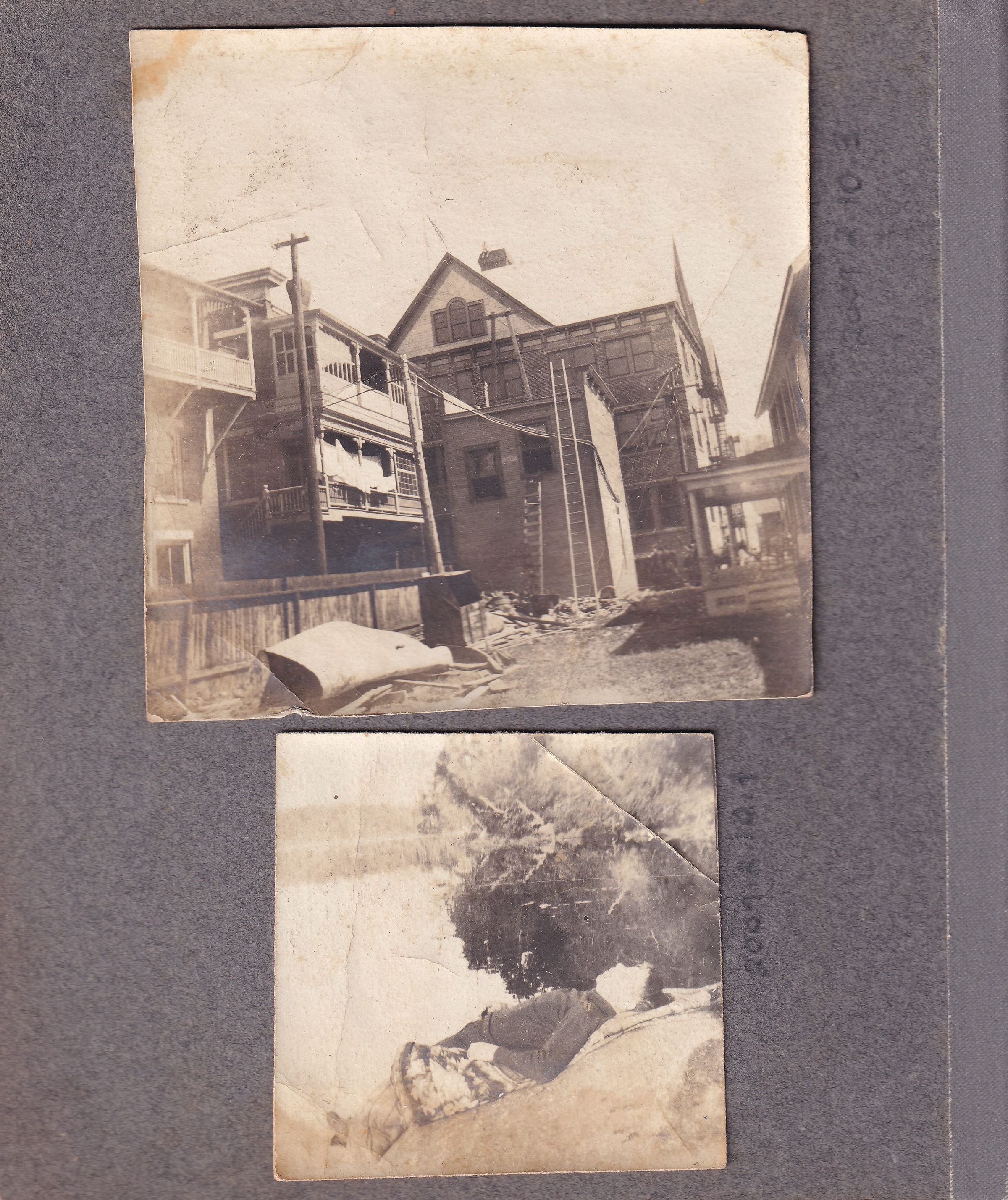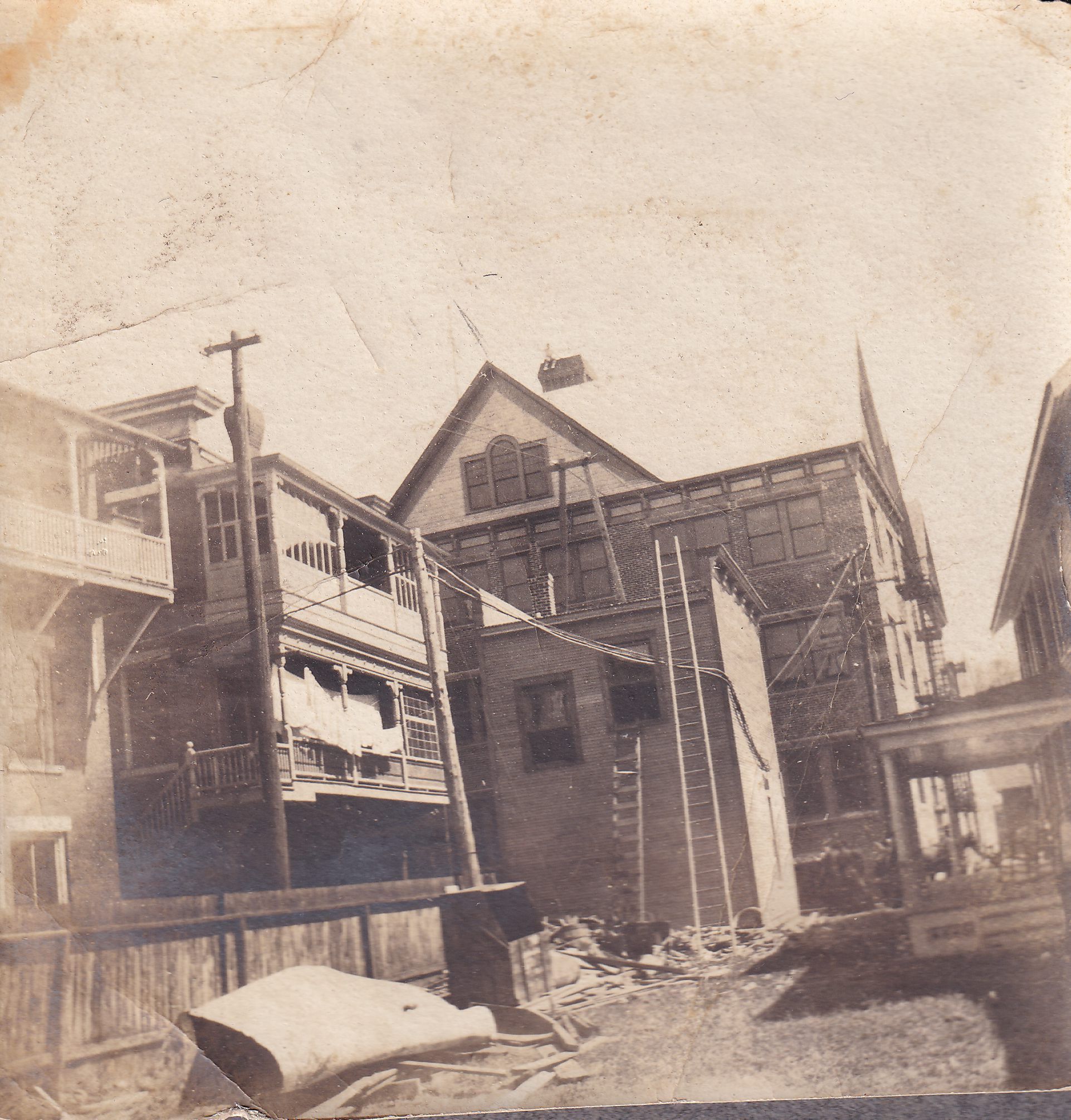 Photograph of the alleyway between Main Street and Academy Street, with a view of the old Saranac Lake High School. The back sides and cure porches of Leonard's Department Store (83-85 Main Street [86]), the Harding Block (89 Main Street [90]), and 5 Academy Street [8] can be seen at left. The side of 7 Academy Street [12] can be seen at right.Photograph Details