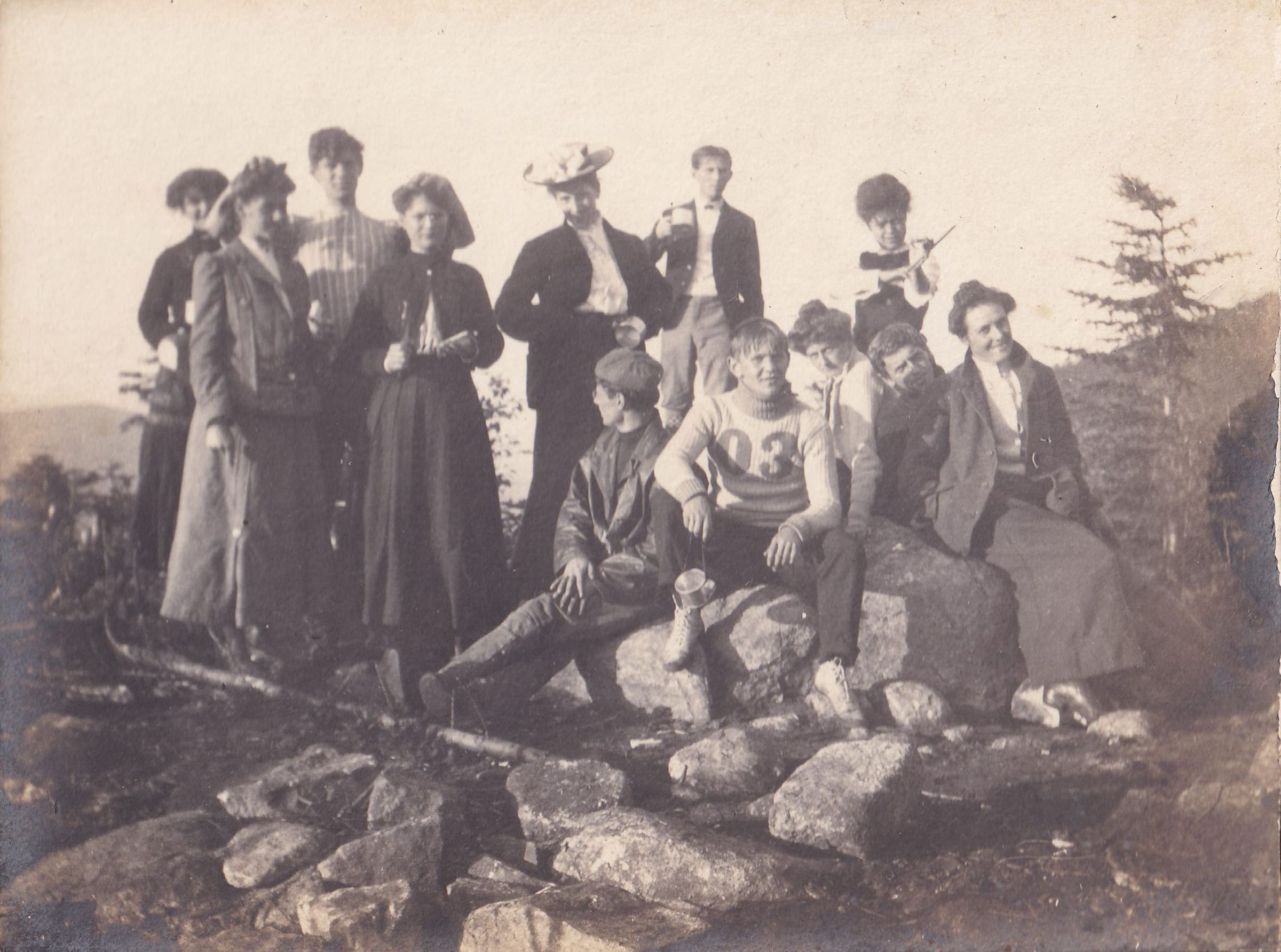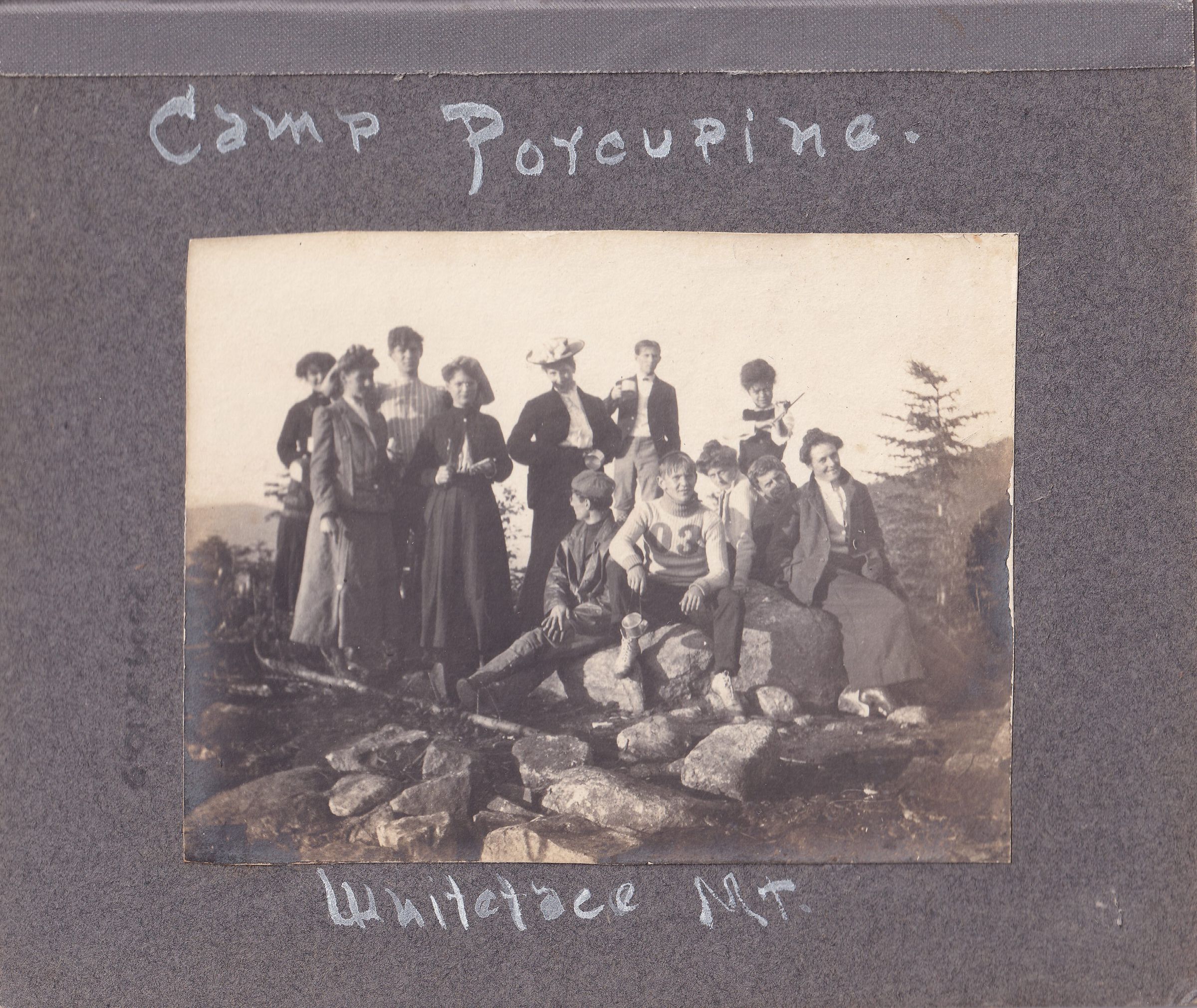 Photograph of a group of young people seated on or standing around rocks on Whiteface Mountain. Blanche Smith is standing second from the left holding what appears to be a butter knife in her left hand. The young man behind her has his left hand on her head. The young man walking up from behind the group with a mug in his right hand may be Ernest Ayer. Handwritten caption reads, "Camp Porcupine. Whiteface Mt."