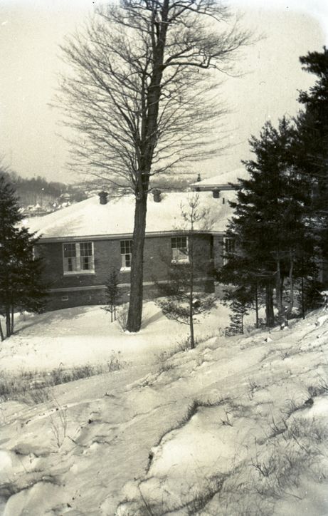Negative of the back of a brick building during winter. Most likely taken by Mary Ives Baldwin. This item is not fully cataloged but has been uploaded so the image is publicly available; if you would like us to prioritize cataloging this item, please contact the HSL Collections team.