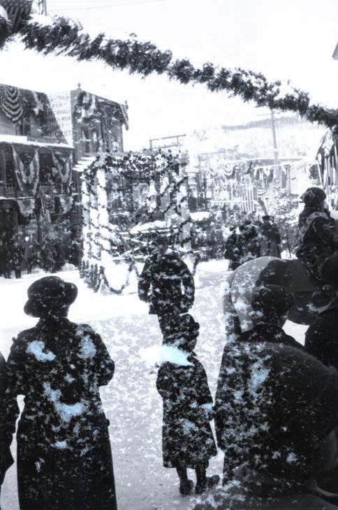 Negative of a Winter Carnival parade. There is a float in frame that looks like a pergola with streams of greenery wrapped around the columns. Most likely taken by Mary Ives Baldwin. This item is not fully cataloged but has been uploaded so the image is publicly available; if you would like us to prioritize cataloging this item, please contact the HSL Collections team.