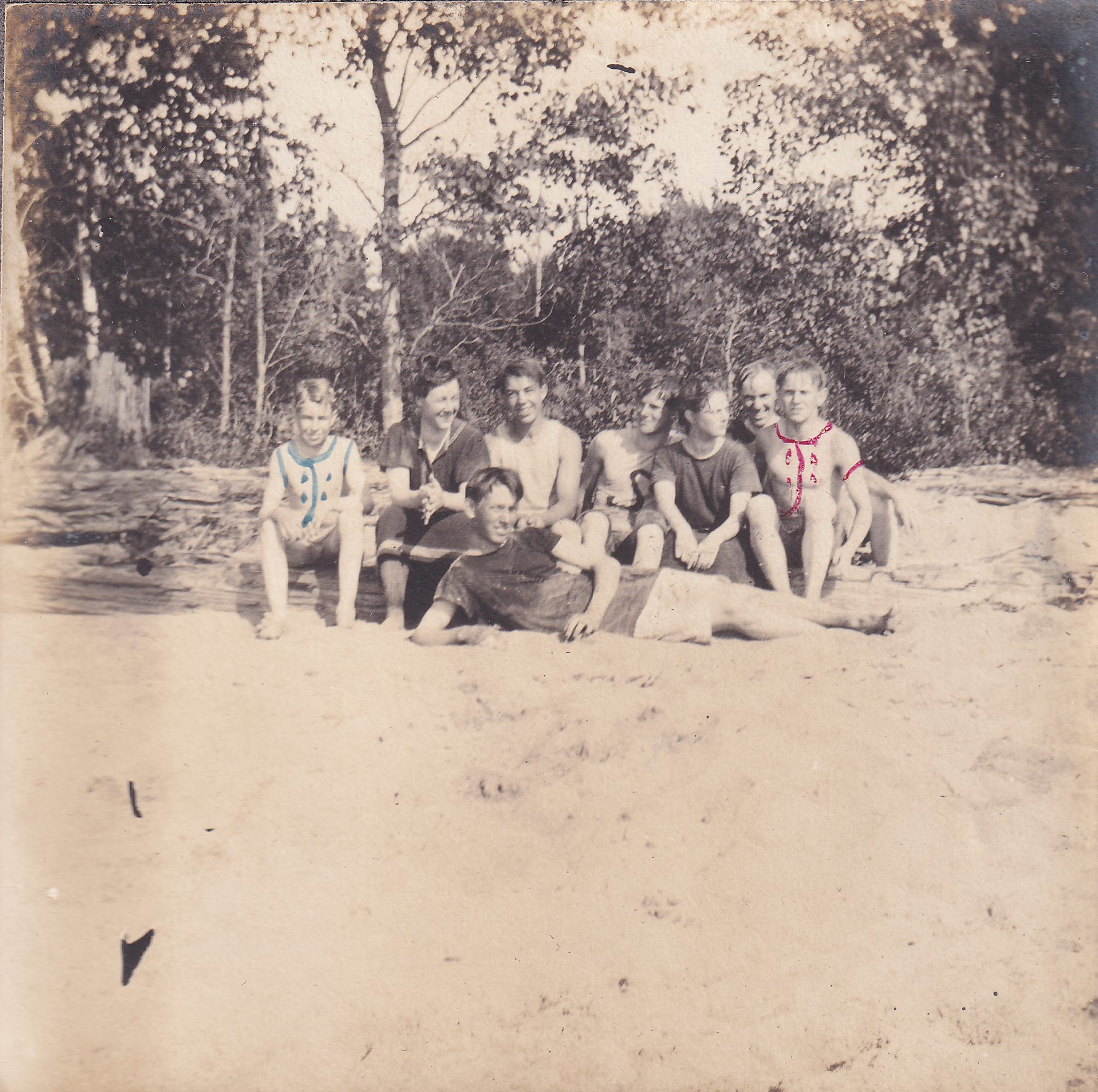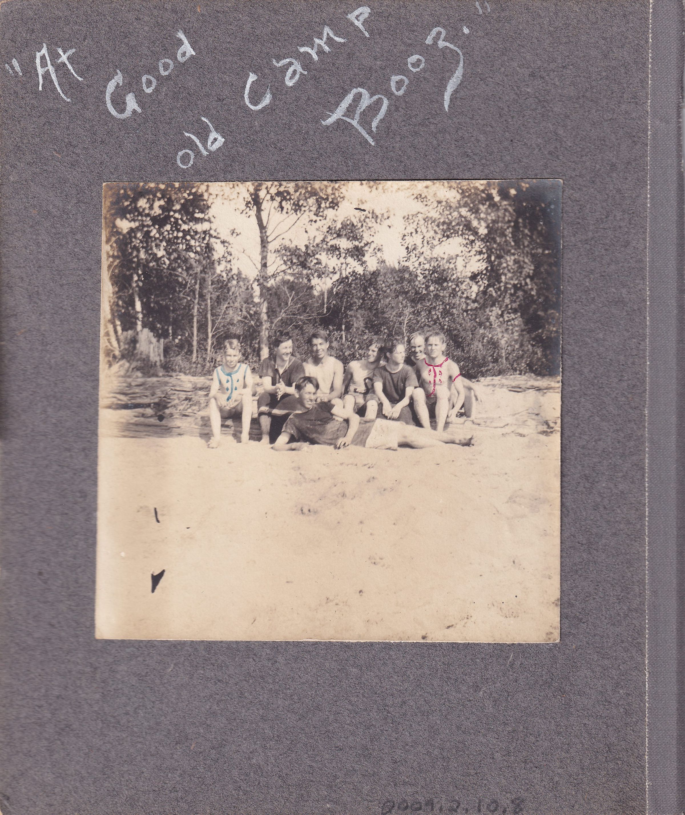 Photograph of a group of young people seated on a sandy beach. Two of the young men are shirtless, but have had shirts drawn on them with red and blue ink. Handwritten caption on page reads, "At Good Old Camp Booz."