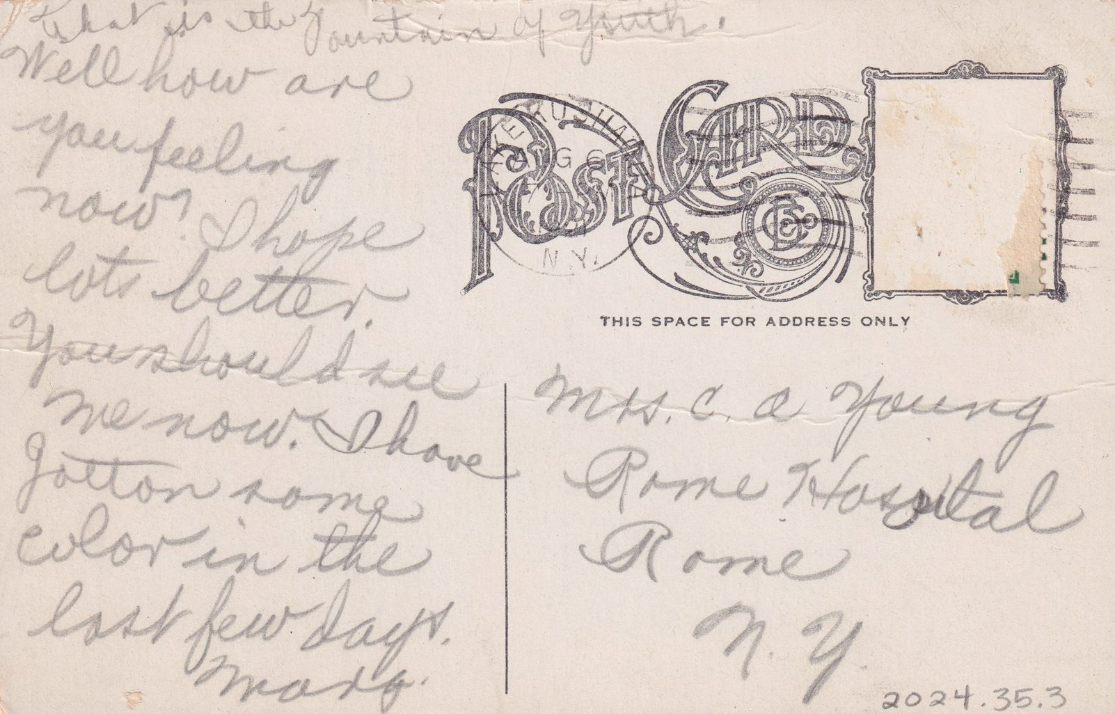 Black-and-White postcard showing the fountain and chapel at Stony Wold Sanatorium. Printed caption on front reads, "Stonywold Hall and Fountain, Lake Kushaqua, N. Y." No printer's mark. Used, divided back, postmarked Lake Kushaqua, NY, August 6, 19[21?]. Handwritten message on back reads, "That is the fountain of youth. Well how are you feeling now? I hope lots better. You should see me now. I have gotton [sic] some color in the last few days. Marg." Mailed to Mrs. C. A. Young, Rome Hospital, Rome, NY.Subject Place