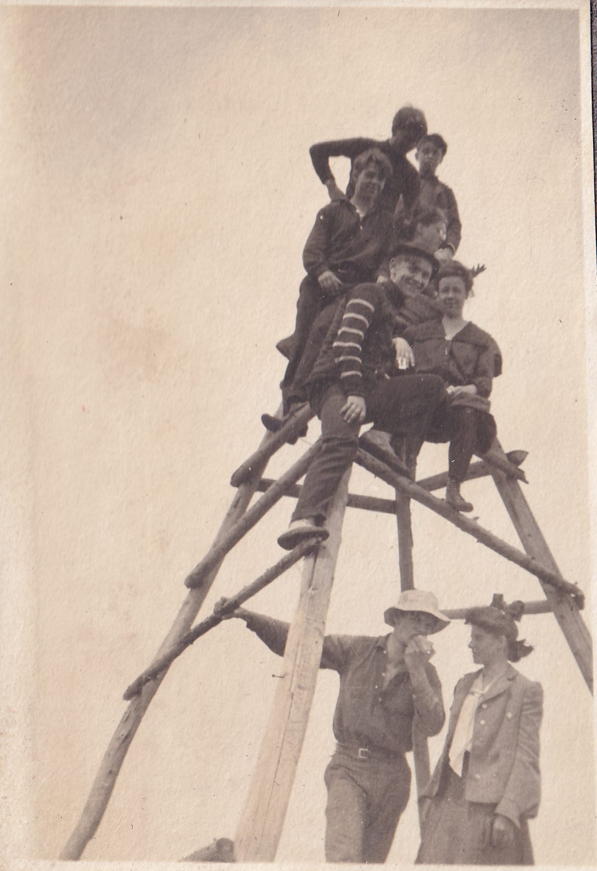 Photograph of a group of young people atop and underneath a wooden structure. Handwritten caption on page reads, "Git Out You Water Bug."