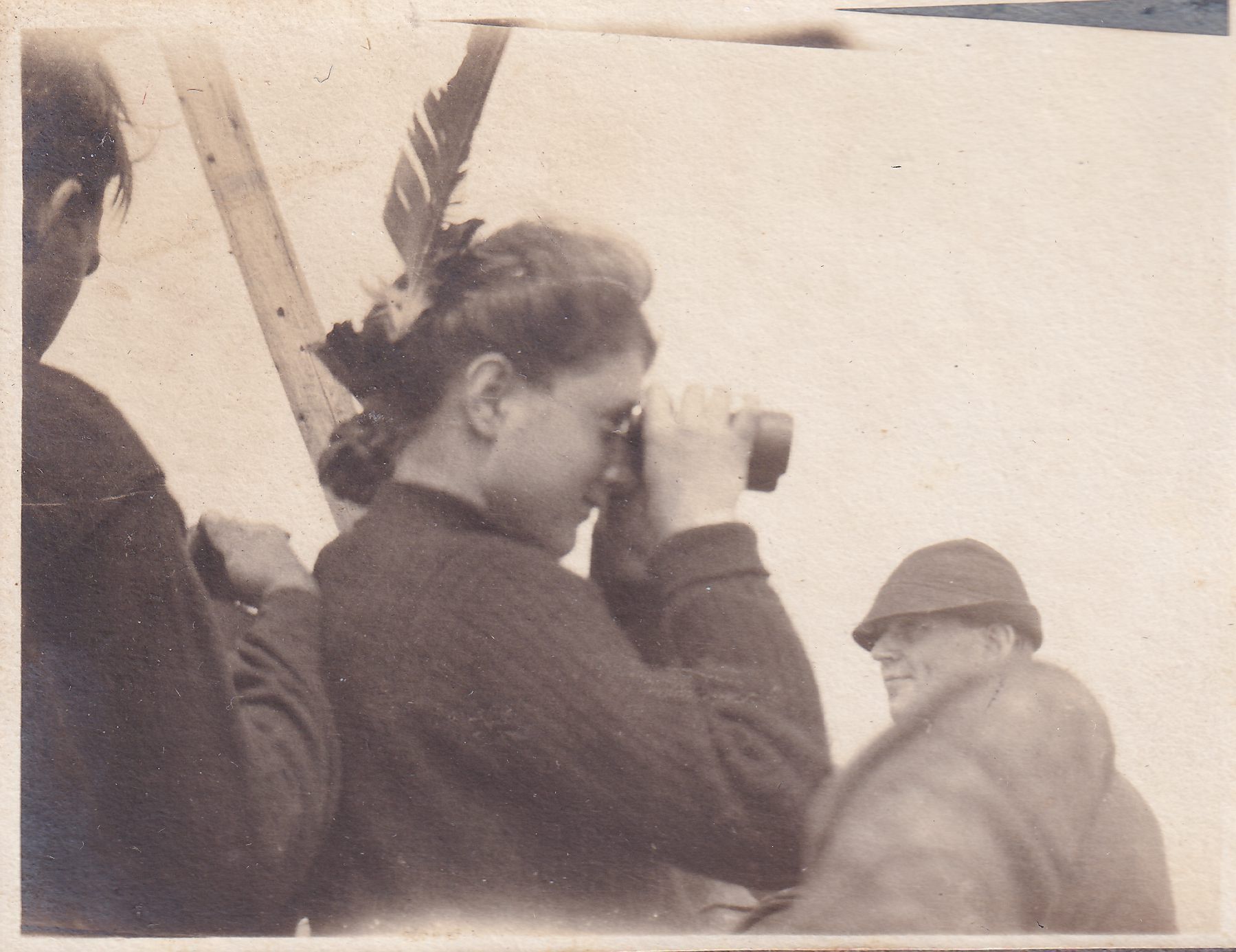 Photograph of Blanche Smith with a feather in her hair looking to the right with a pair of binoculars. Handwritten caption on page reads, "See the Flam."