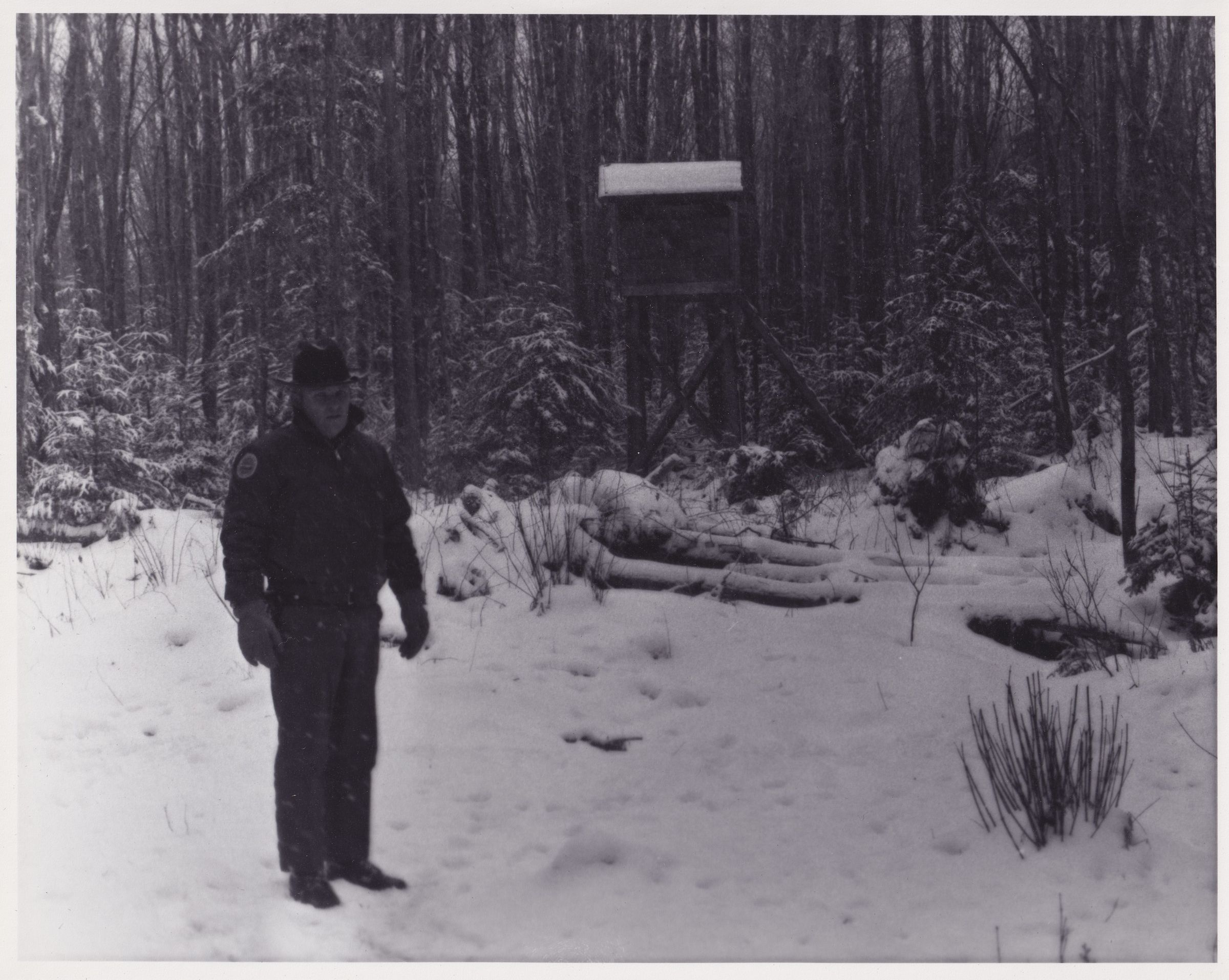 Black-and-White photograph of a man in a game warden uniform standing in the snow. A hunting blind is visible behind him. Handwritten note on back reads, "#1 11/17/83. F8 Aperture, 1/125 shutter speed, 12:20 PM, facing north."Lexicon