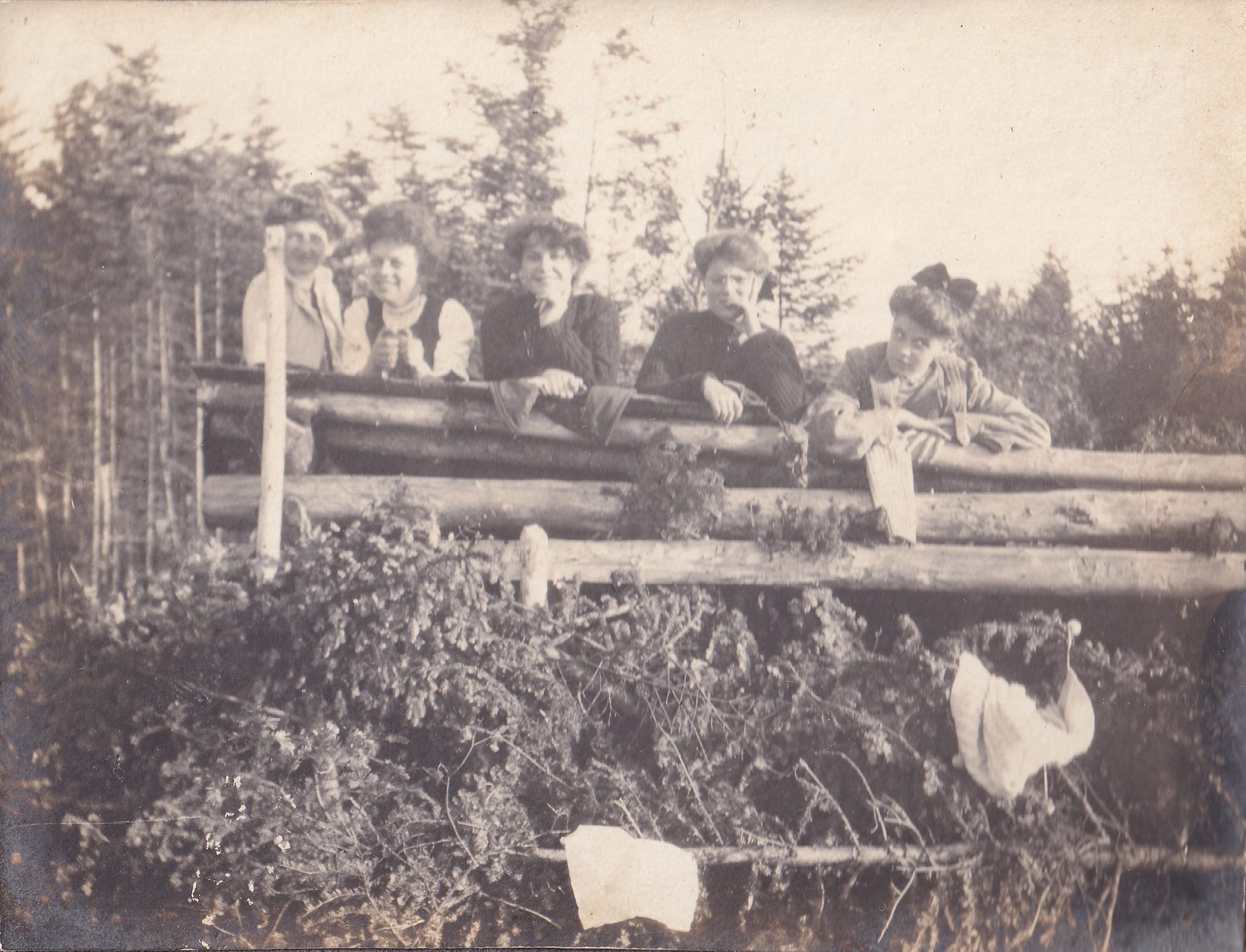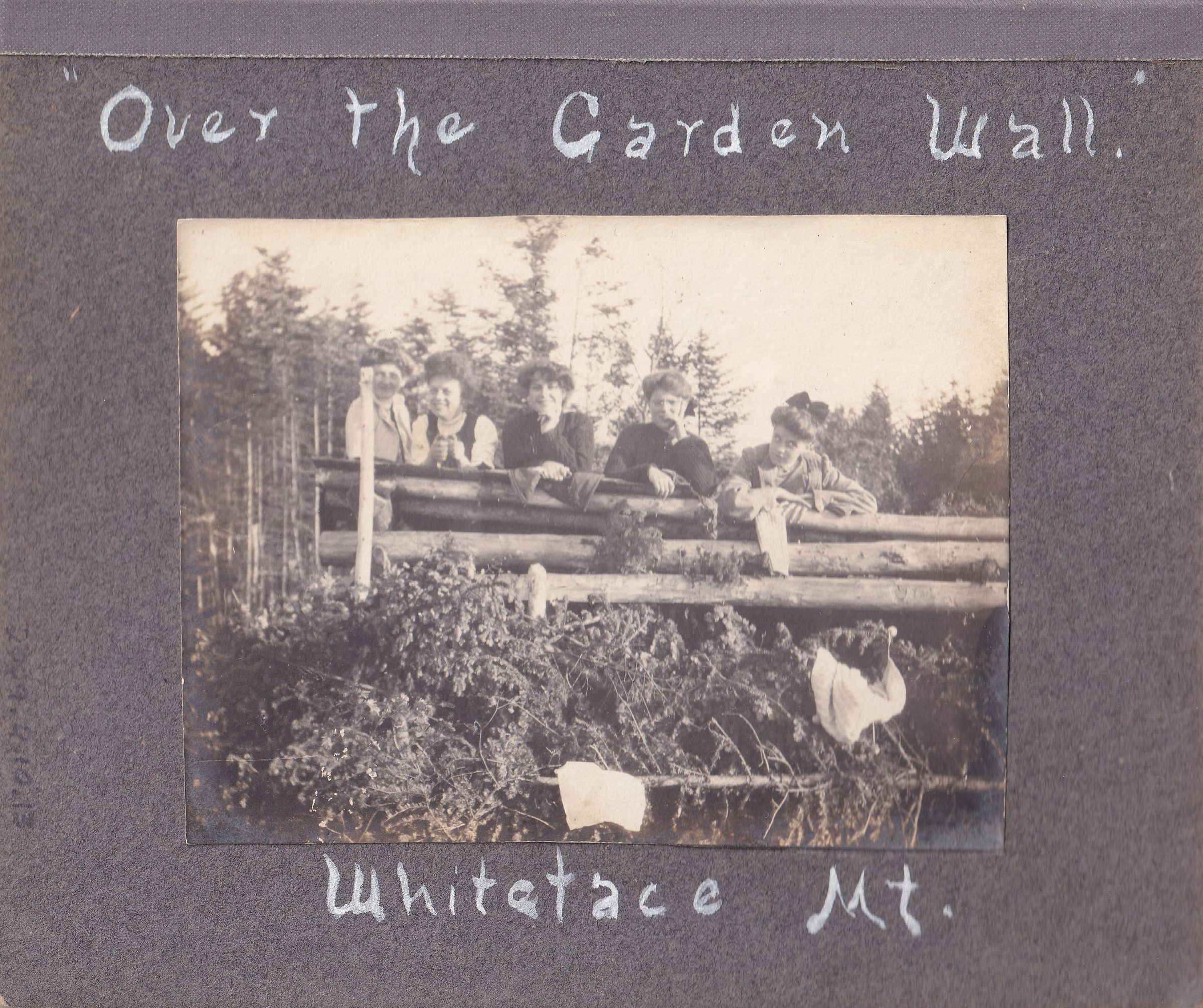 Photograph of a group of young women looking out over a wooden lean-to or fence. Blanche Smith is standing second from right. Handwritten caption on page reads, "Over the Garden Wall. Whiteface Mt."