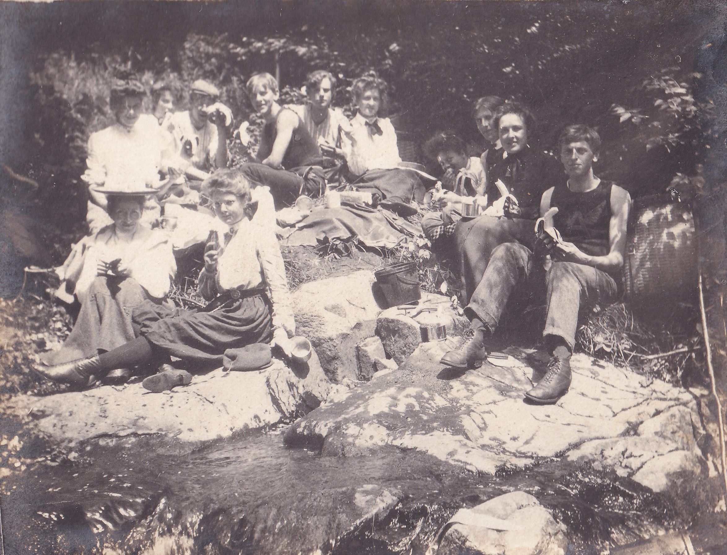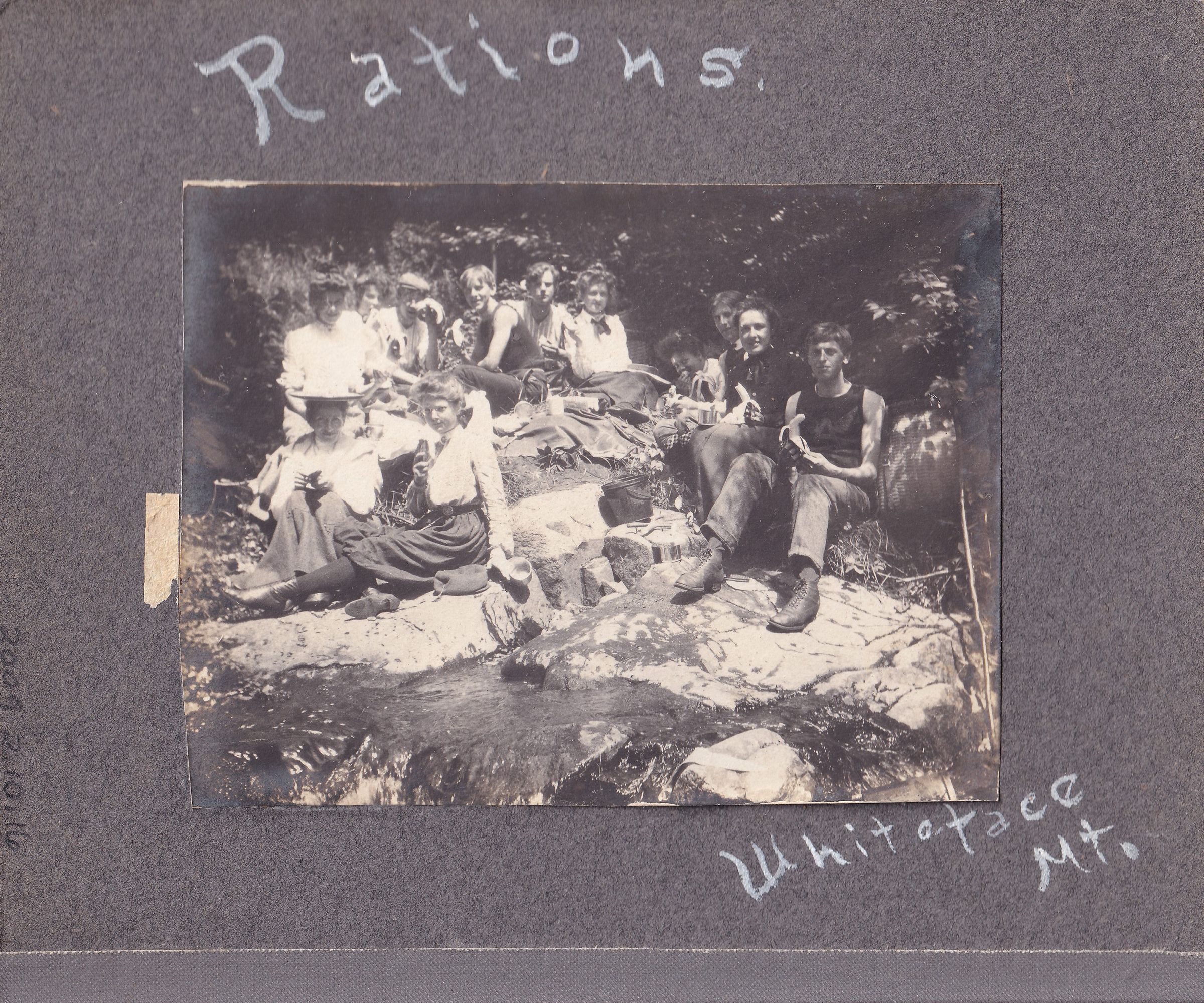 Photograph of a gorup of young people seated on rocks in a stream, eating a picnic. William (Bill) Distin is seated at right, eating a banana, and Blanche Smith is seated second from left in the front. Handwritten caption on page reads, "Rations. Whiteface Mt."Photograph Details