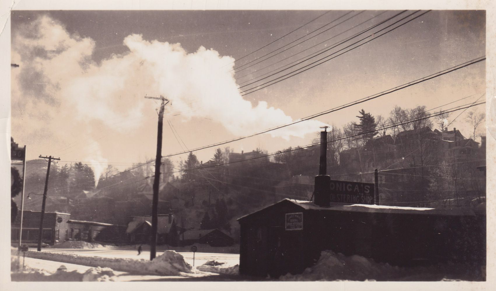Black-and-White photograph of an unidentified commercial building. The sign atop the building reads, "[?]onica's [?]oestring Shop." There are houses visible on the hill behind the building, possibly on French Hill. The photograph was likely printed by Kollecker's Kodak and Gift Shop.Collection