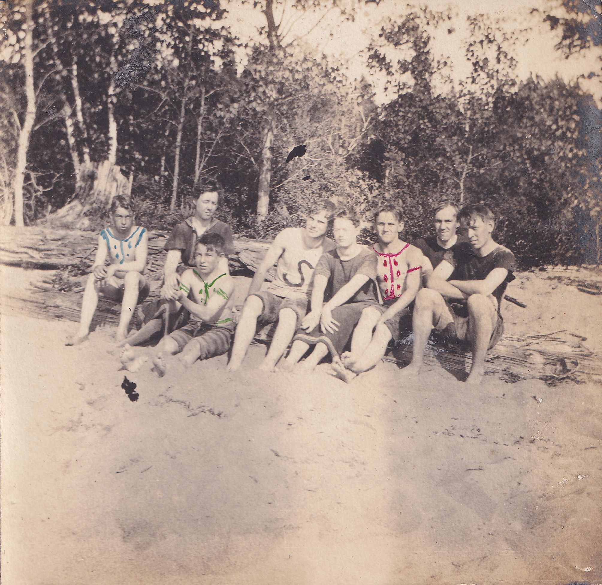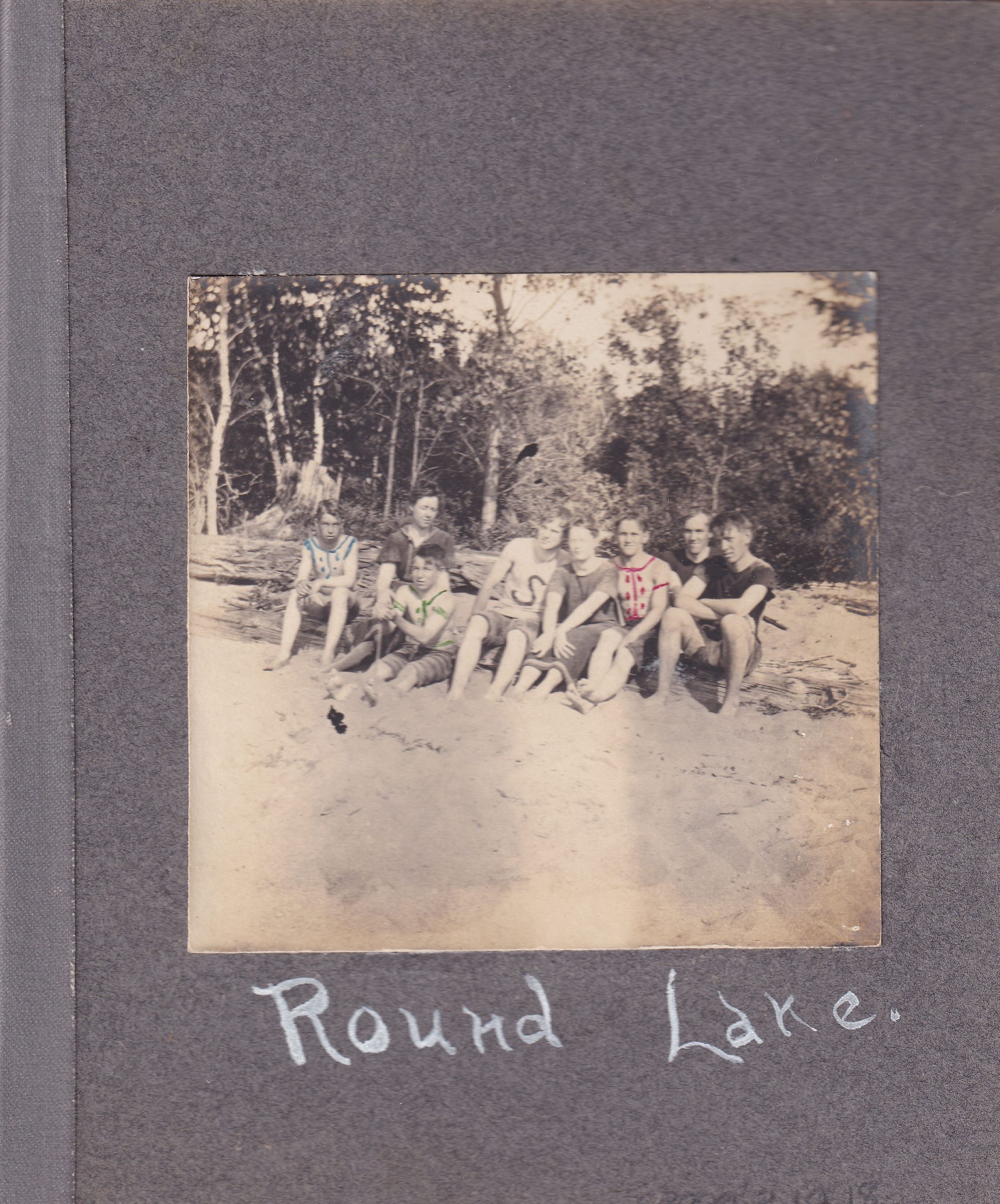 Photograph of a group of young people seated on a log on a beach. Some of the young men are shirtless and shirts have been drawn on them in blue, green, and red ink. Blanche Smith is seated fourth from right, and William G. Distin may be seated to her right. Handwritten caption on page reads, "Round Lake."Photograph Details