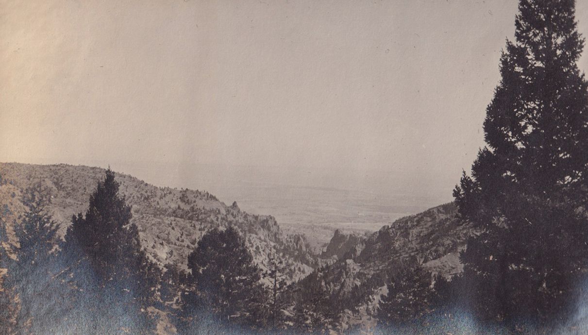 Black-and-white photograph taken from the side of a mountain, looking out over the incline and another smaller hill. There are many trees on the side of the mountain.