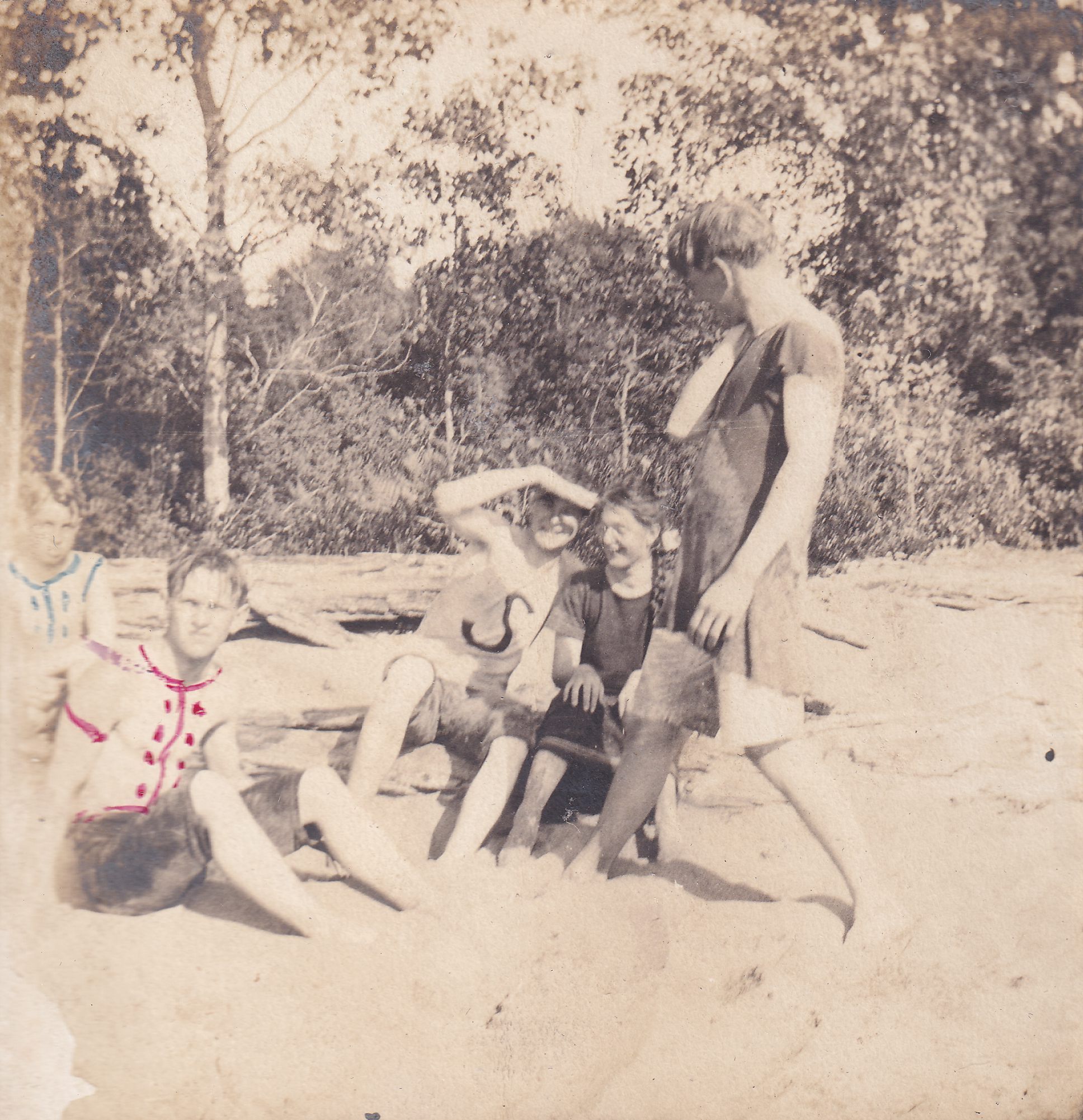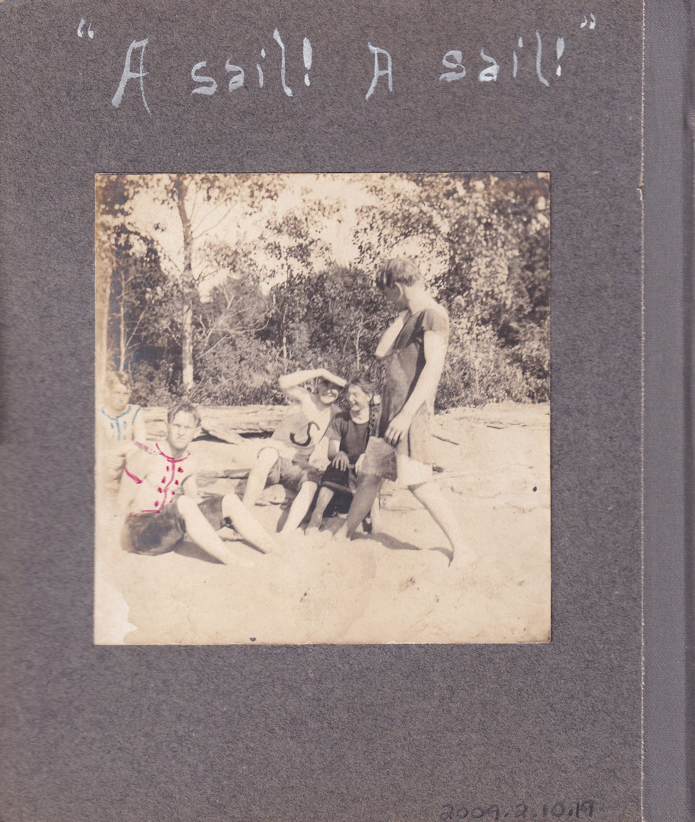 Photograph of a group of young people on a beach. A couple of young men are shirtless; shirts have been drawn on them with red and blue marker. Handwritten caption reads, "A sail! A sail!"