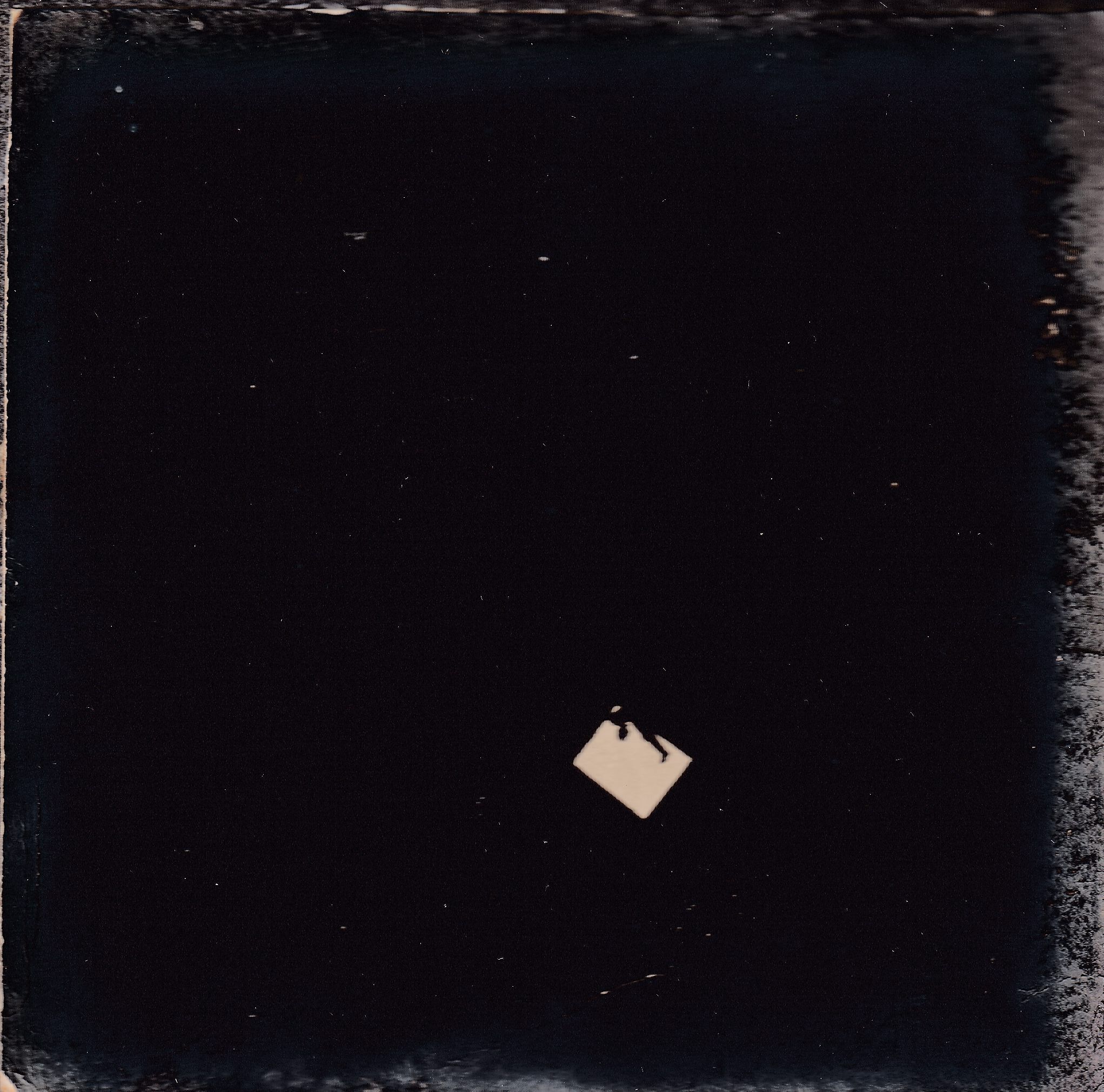 Photograph of a mostly black scene, with a small white square in it, that appears to contain a partial silhouette of a person. Likely taken looking up a chimney.Collection