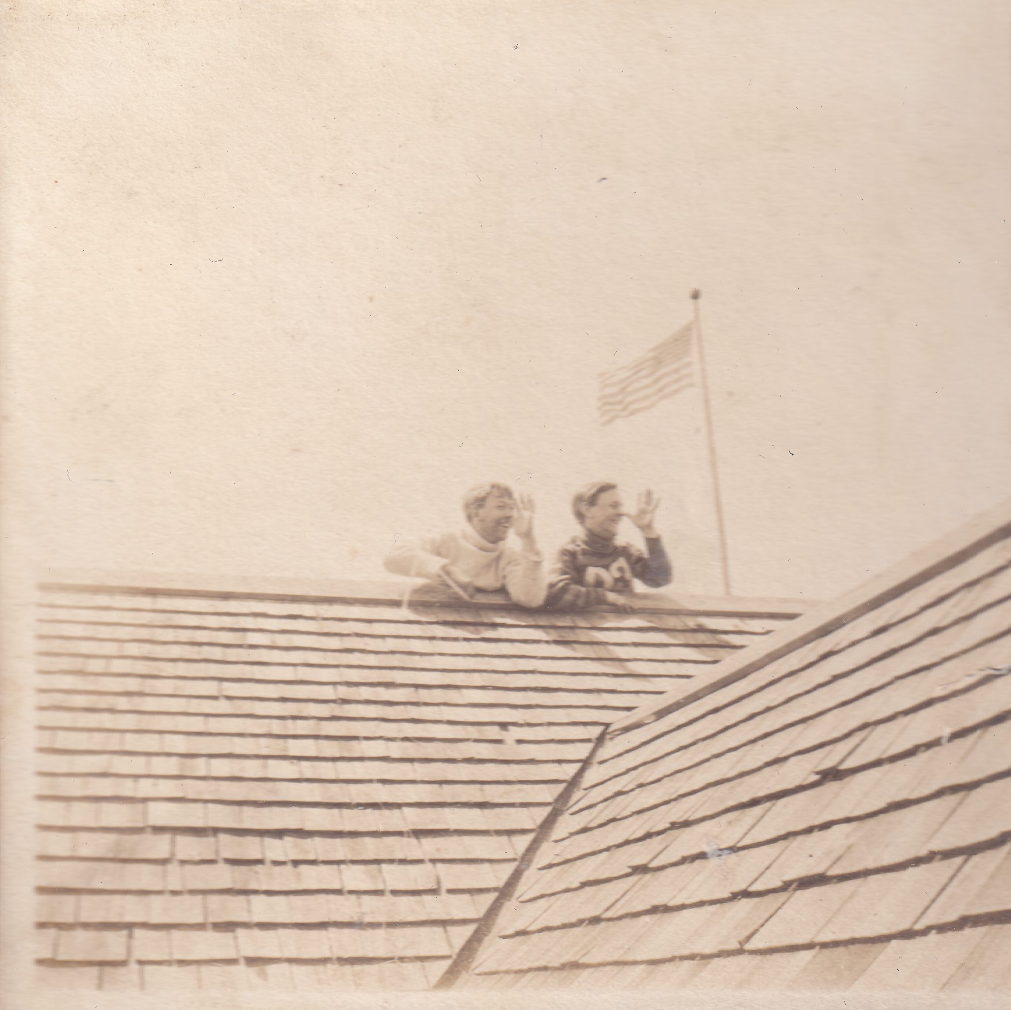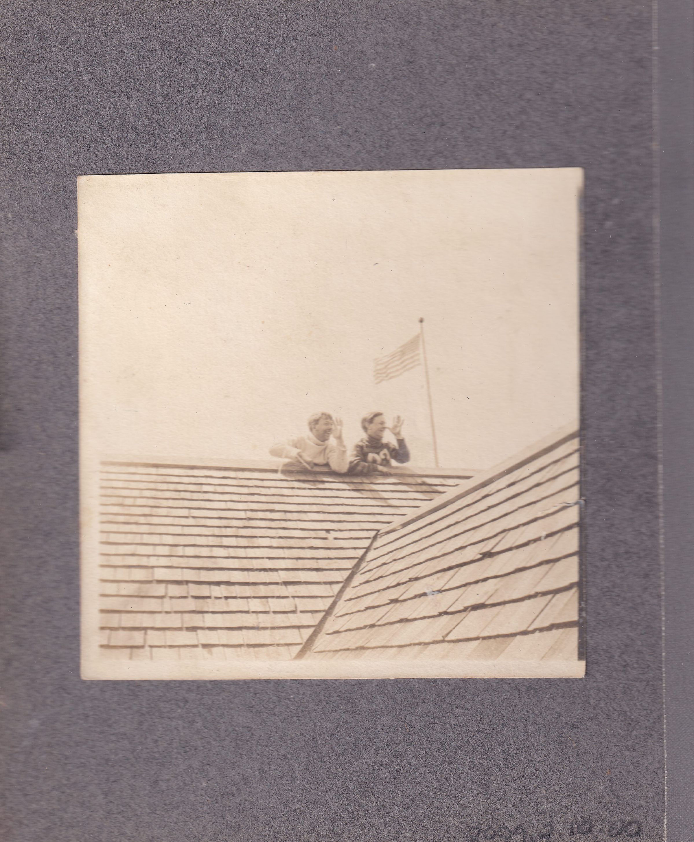 Photograph of two young men looking over the roof of a building. Both men are thumbing their noses (raising their thumbs to their noses with fingers outstretched) and looking off to the side.