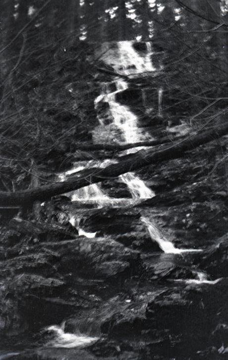 Negative of a small stream flowing down rocks and over tree roots in a forested area. Most likely taken by Mary Ives Baldwin. This item is not fully cataloged but has been uploaded so the image is publicly available; if you would like us to prioritize cataloging this item, please contact the HSL Collections team.