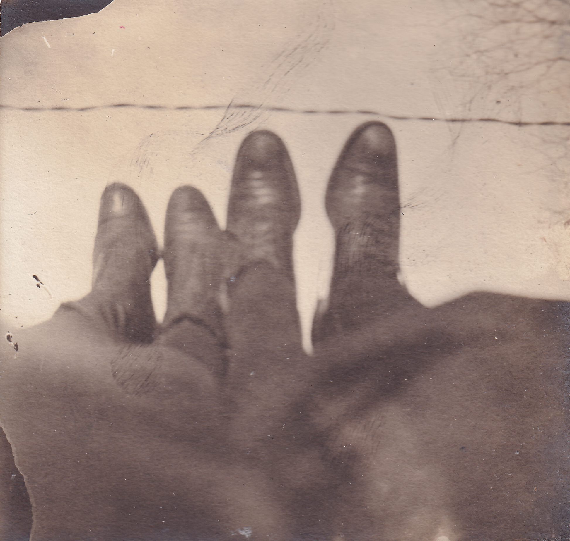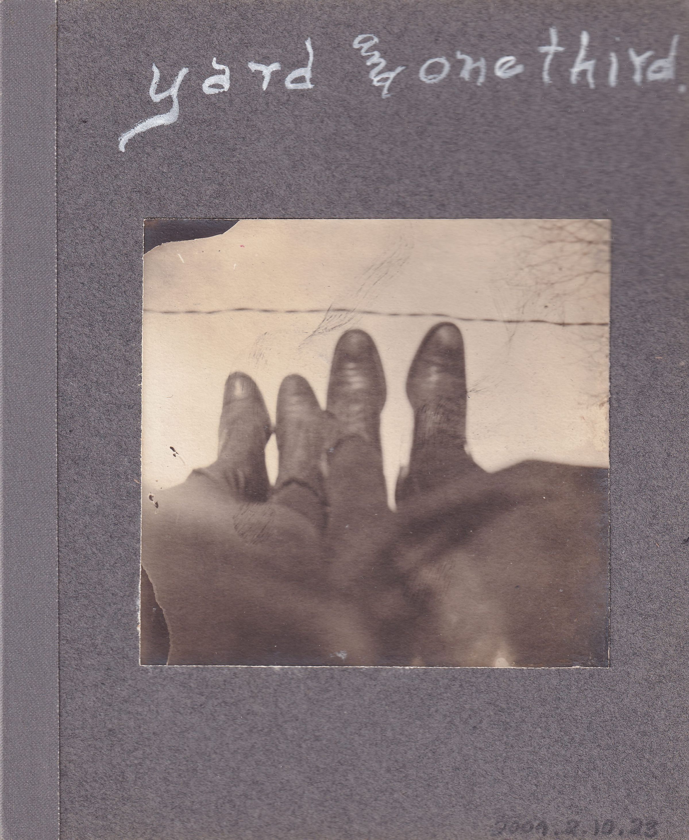 Photograph of two pairs of women's feet raised up in the air. Tree branches and a power line can be seen in the distance. Handwritten caption on page reads, "Yard and One Third."