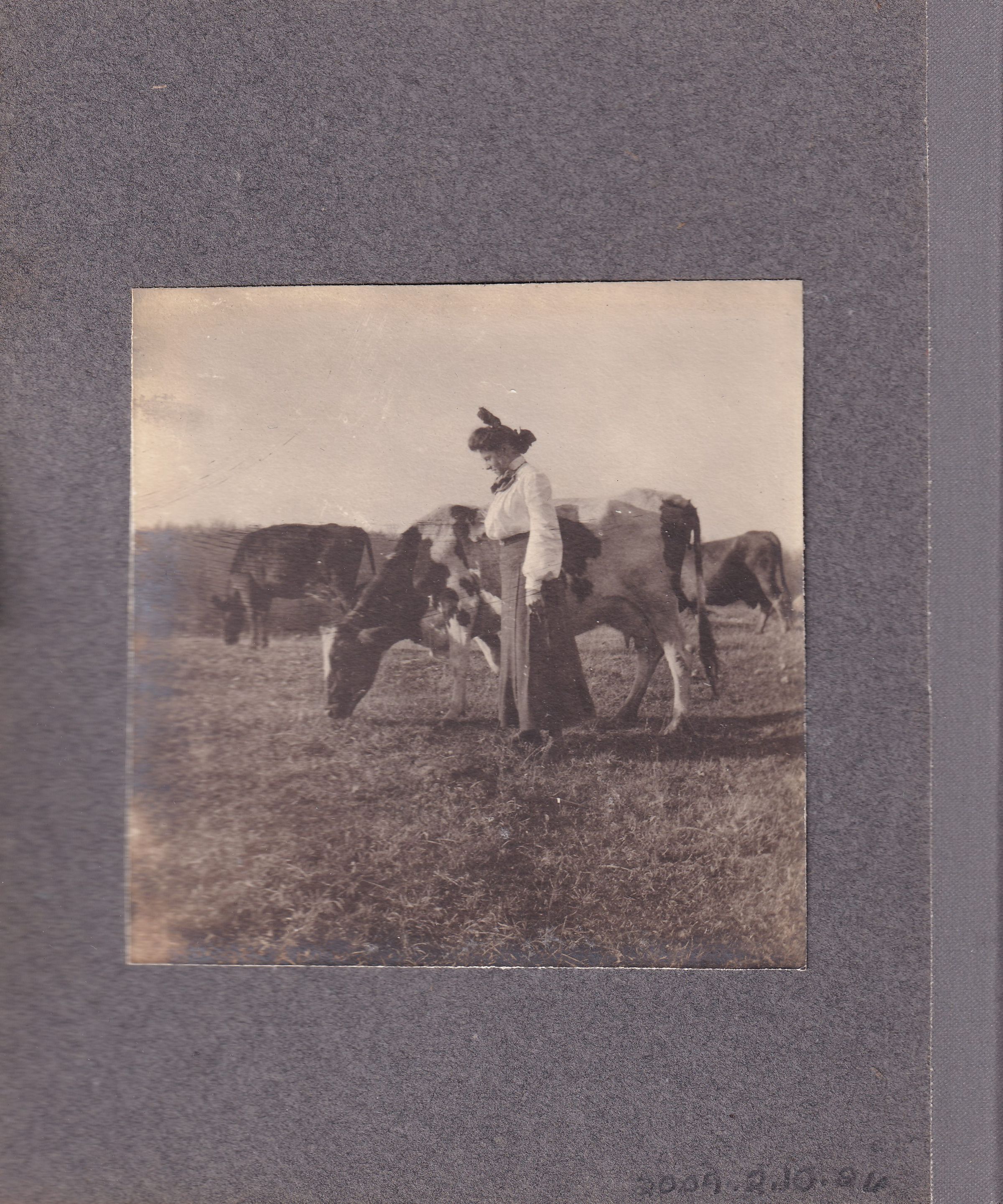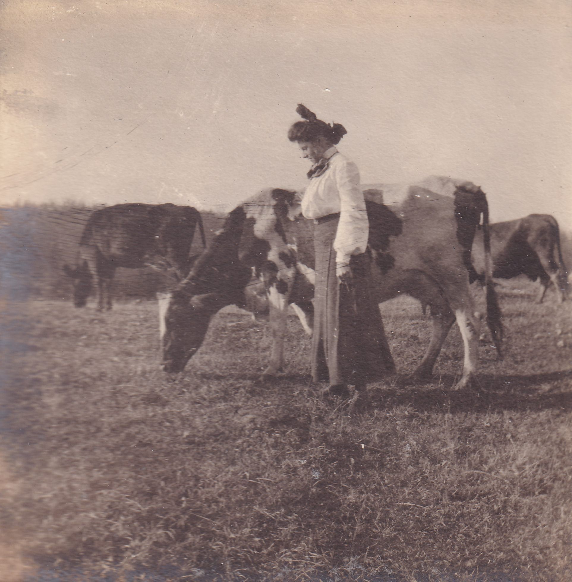 Photograph of a young woman standing in profile next to a cow in a field. Other cows can be seen behind them.