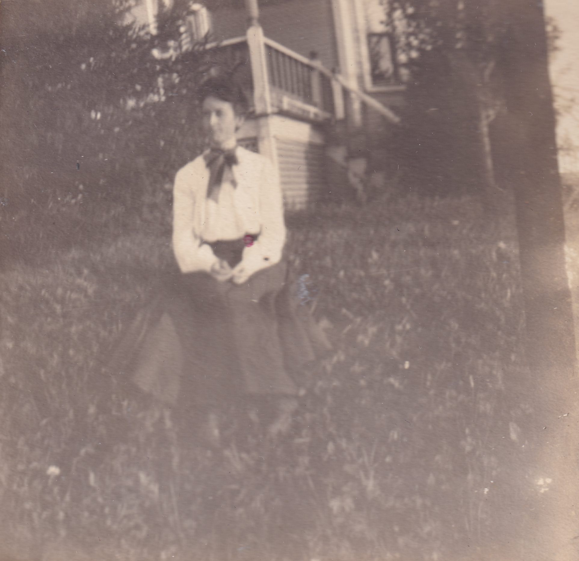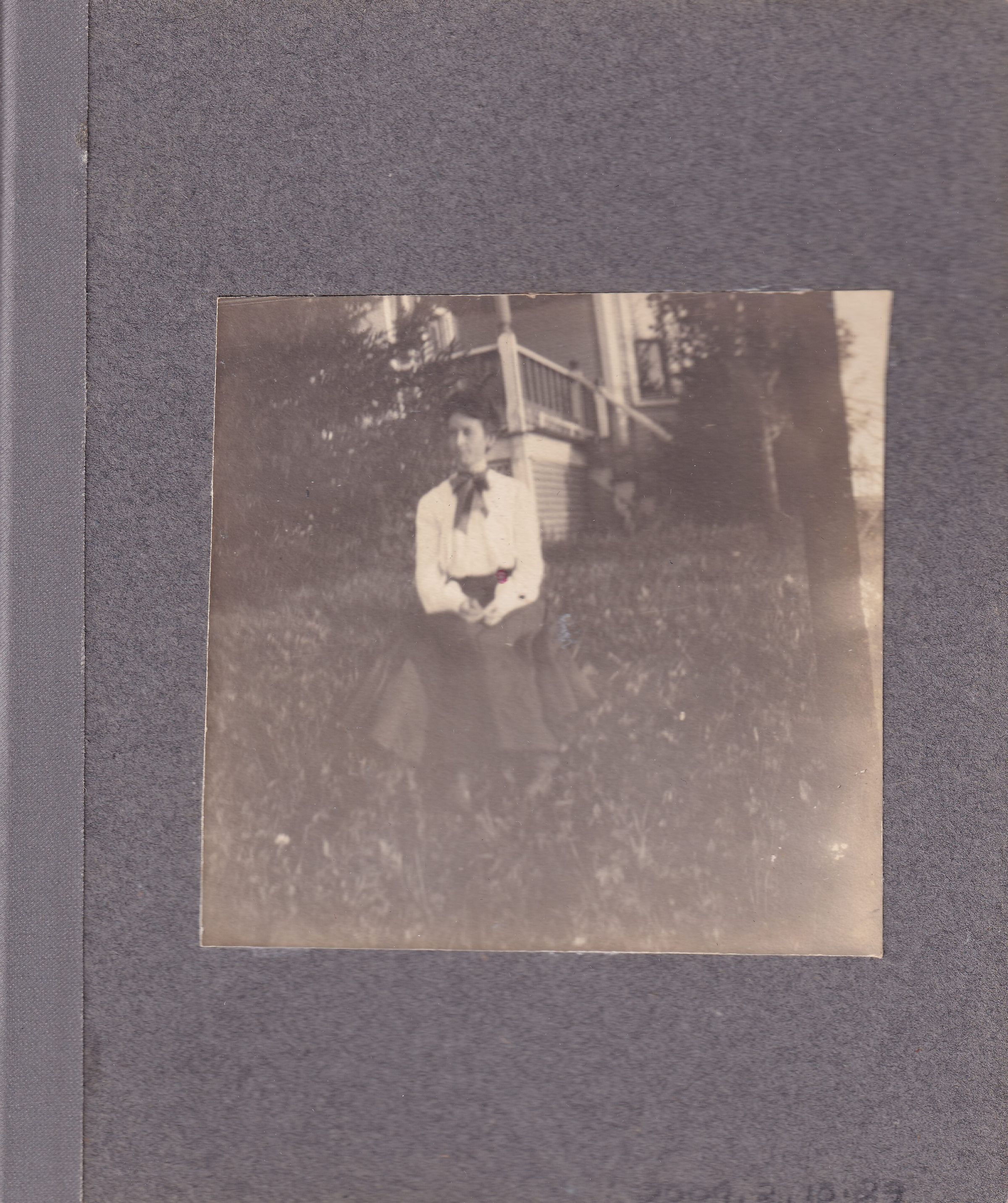 Photograph of a young woman sitting in the grass in front of an unidentified house.