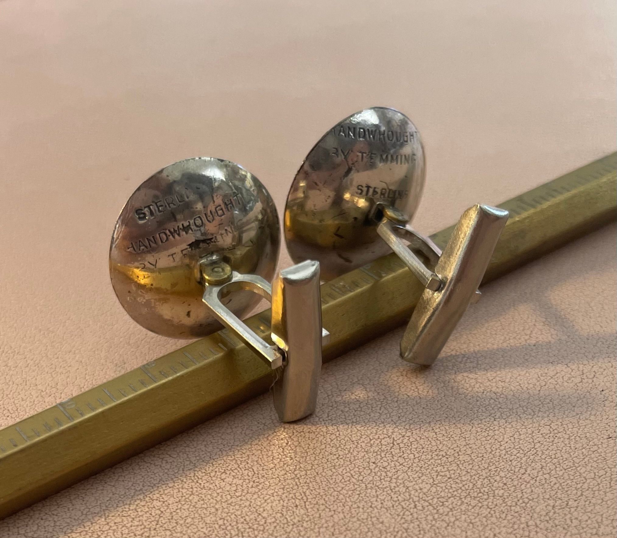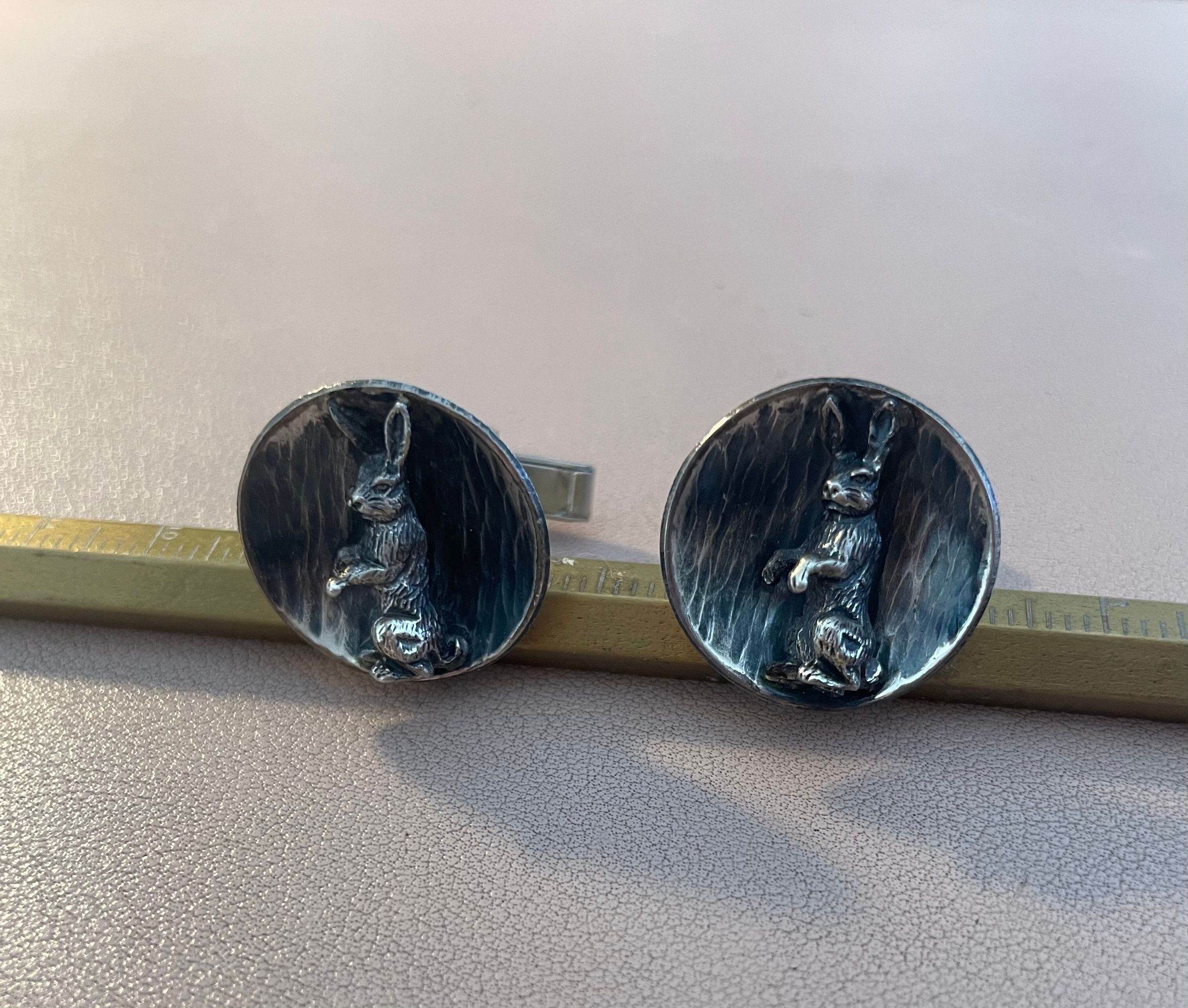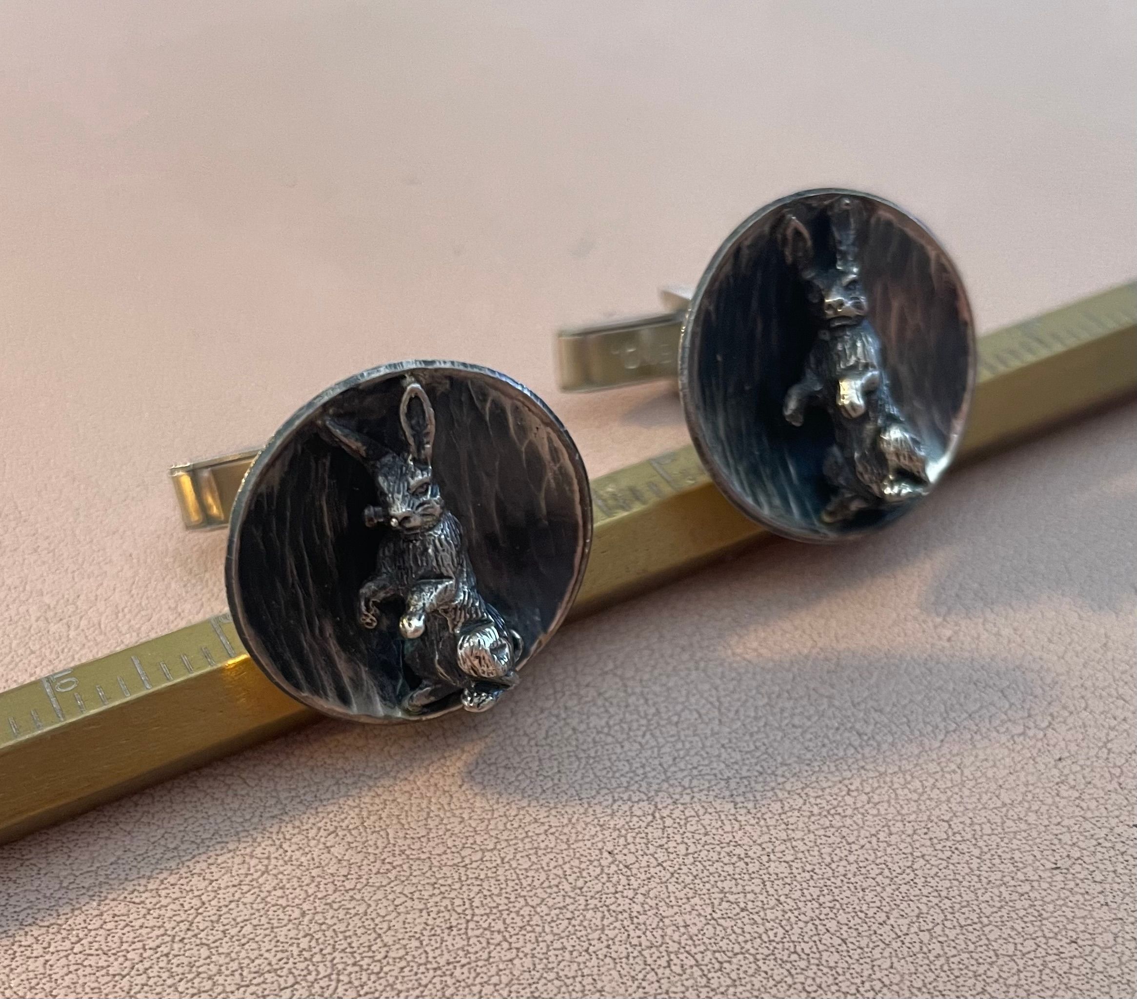 Sterling silver cufflinks with high relief rabbit/hare in circular mount. Stamped, "Sterling, Handwrought by Temming," on reverse.Item Type