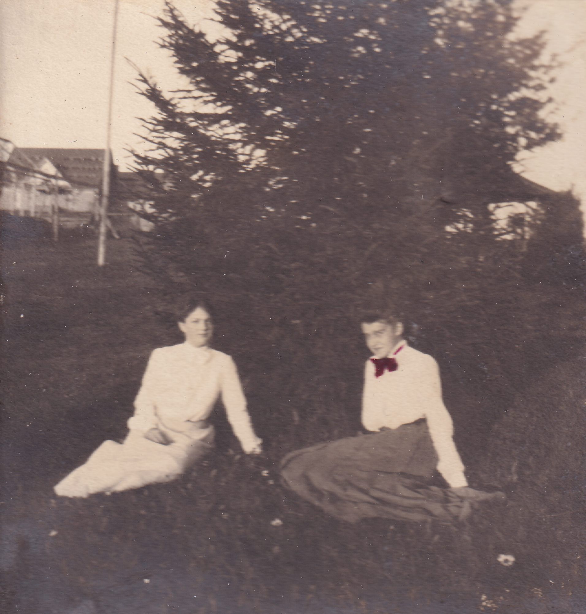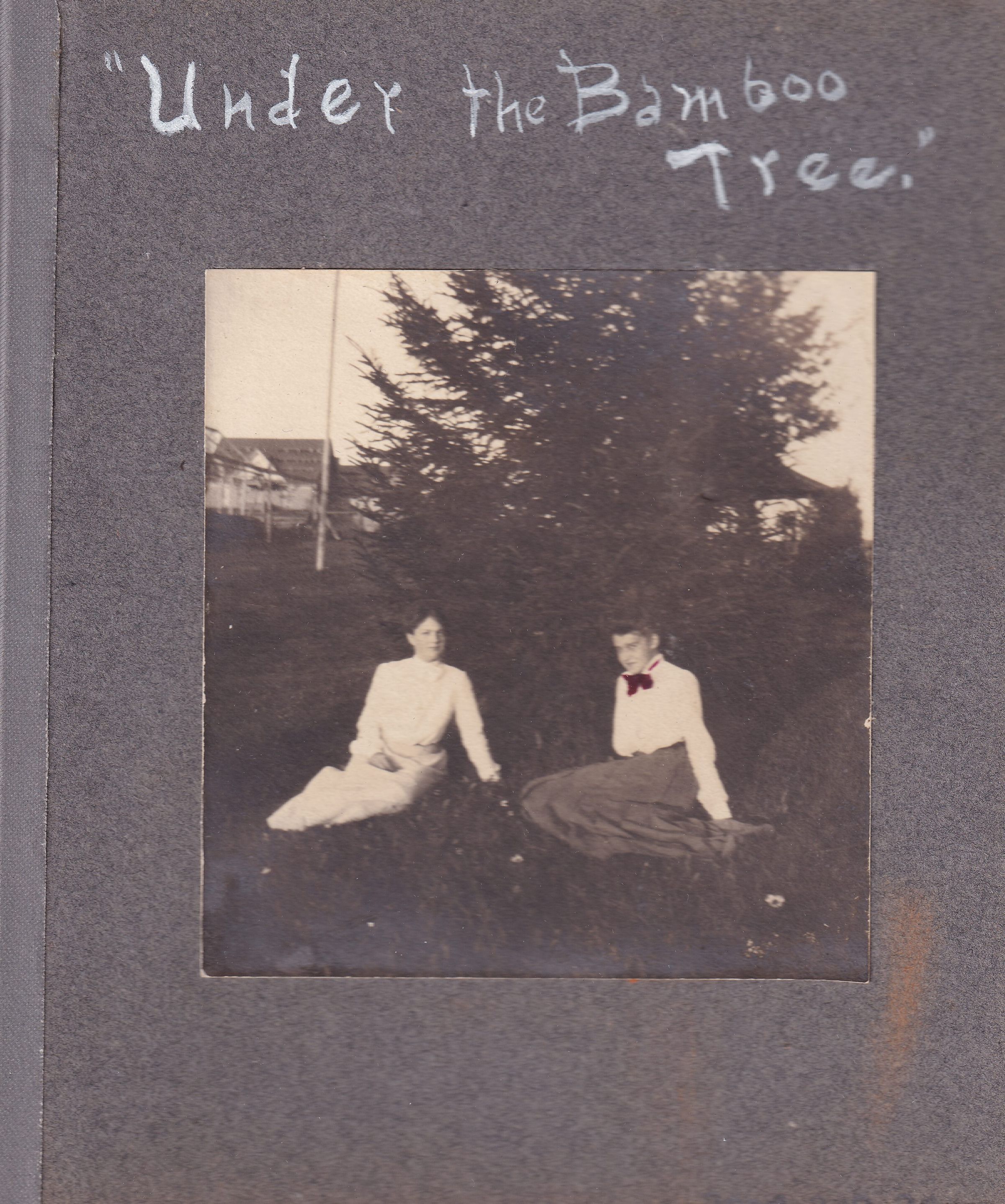 Photograph of Blanche Smith and an unidentified young woman sitting in front of a tree. The young woman's neckerchief has been colored red with pen. Handwritten caption on page reads, "Under the Bamboo Tree."