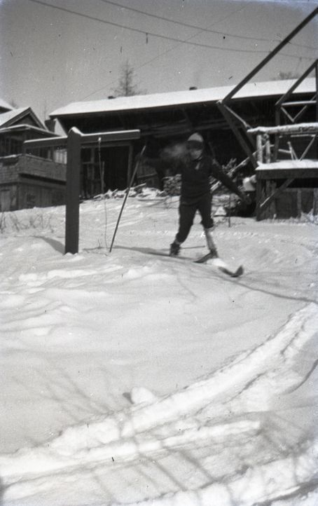 Negative of a young man on skis going downhill behind a barn-like structure. Likely Henry Ives Baldwin. Most likely taken by Mary Ives Baldwin. This item is not fully cataloged but has been uploaded so the image is publicly available; if you would like us to prioritize cataloging this item, please contact the HSL Collections team.