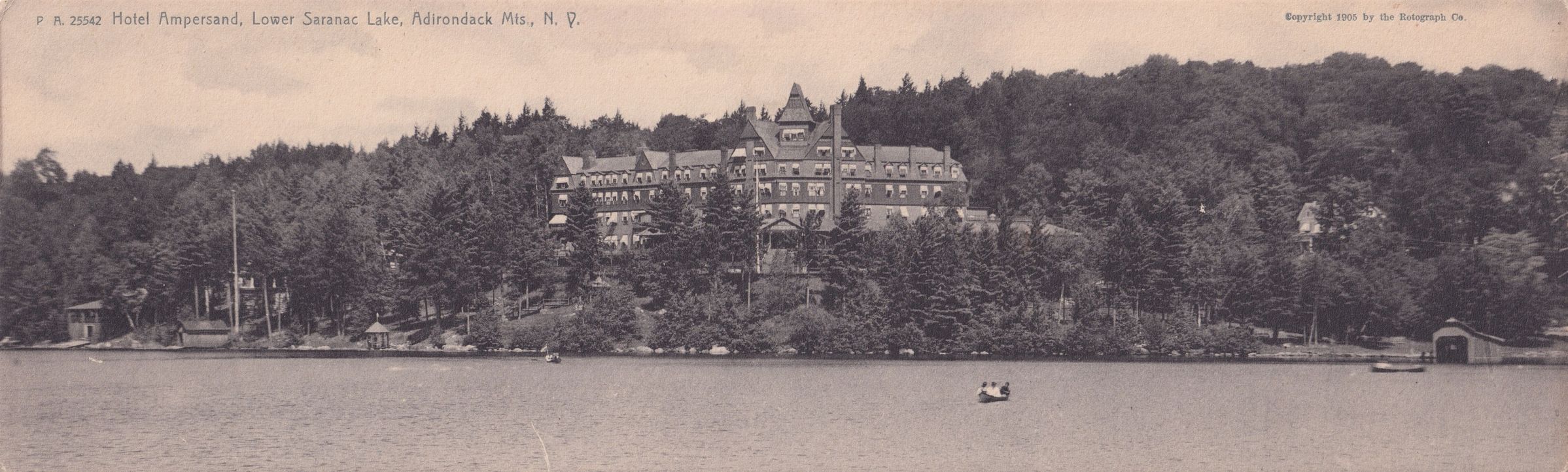 Black-and-white photo postcard of the Ampersand Hotel on Lower Saranac Lake. The postcard shows the hotel sitting on the shore with part of the lake below visible. The title of the postcard, printed in the upper left corner reads "Hotel Ampersand, Lower Saranac Lake, Adirondack Mts, N. Y." In the upper right hand corner is the copyright information, "Copyright 1905 by the Rotograph Co." The postcard is large and folds in half for convenience. Half of the reverse of the postcard is blank while the other half has a place for a mailing address. There is no address or other message written on the postcard.