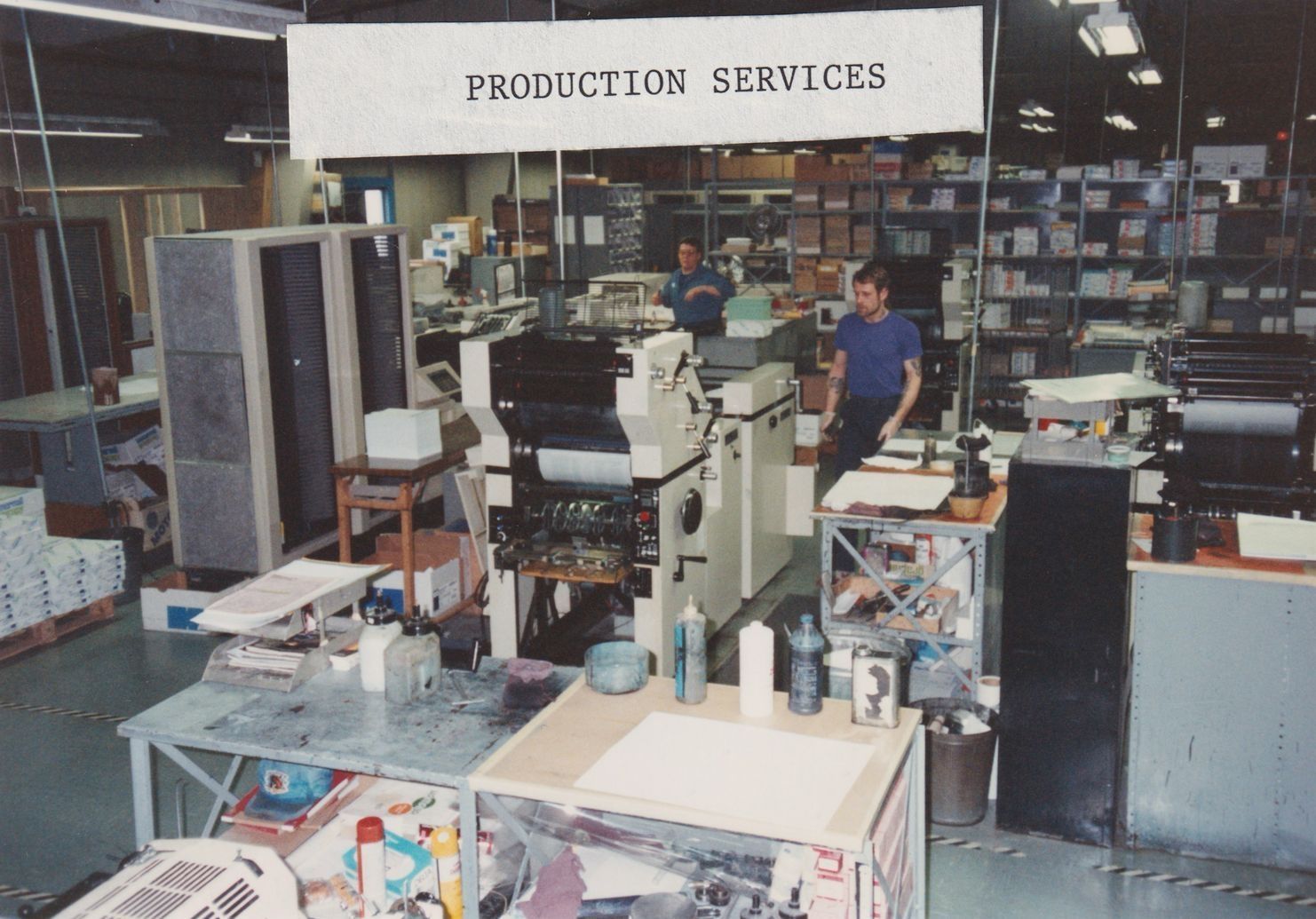 Color photograph of two men in a large room with mechanical equipment and metal shelves in it. One man is standing in front of a large printer. There is a label affixed to the front of the photograph that has "Production Services" typewritten on it. This photograph is from an album of photographs taken at the American Management Association.