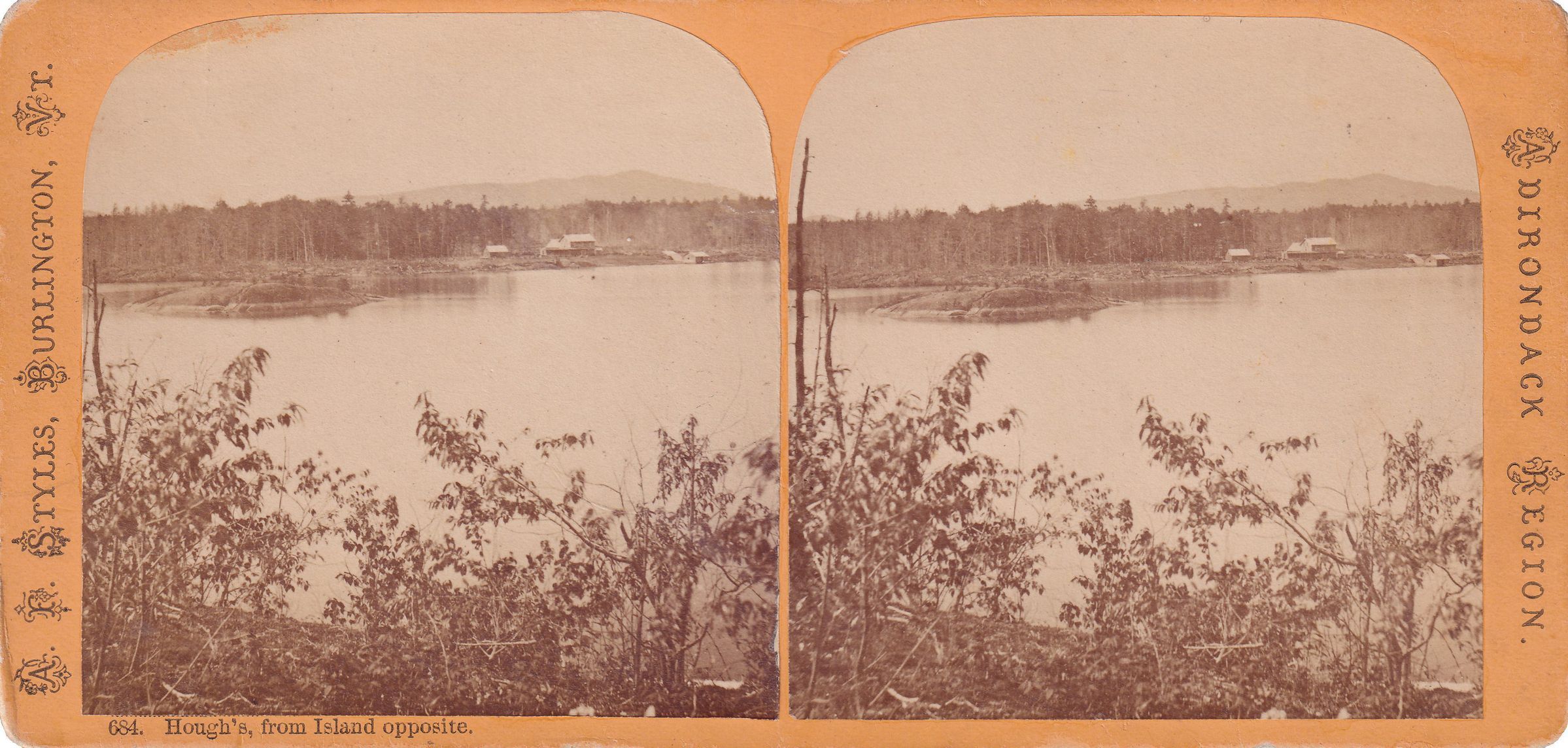 Stereoview card with black-and-white images of Hough's taken from Dry Island. Tommy's Rock is visible in the water. There is a main building and several small outbuiltings visible. Printed caption on front reads, "Hough's, from Island opposite." Mounted on yellow cardboard with "A. F. Styles, Burlington, VT., Adirondack Region," printed along edges. Handwritten note on back reads, "Hough's later became Saranac Inn."