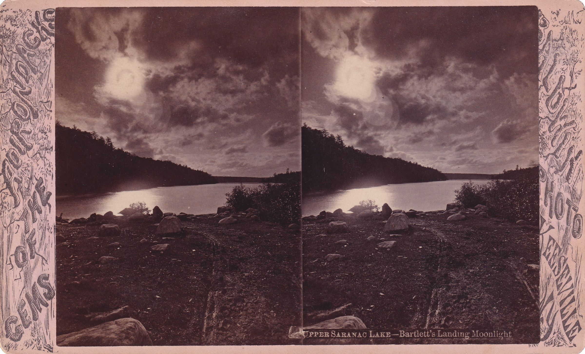 Black-and-white stereoview image of a view toward Upper Saranac Lake. The moon is shining through the clouds. Printed caption on image reads, "Upper Saranac Lake--Bartlett's Landing Moonlight." Mounted on light pink cardboard backing reading, "Gems of the Adirondacks - Baldwin Photo, Keeseville, N.Y."Photograph Details