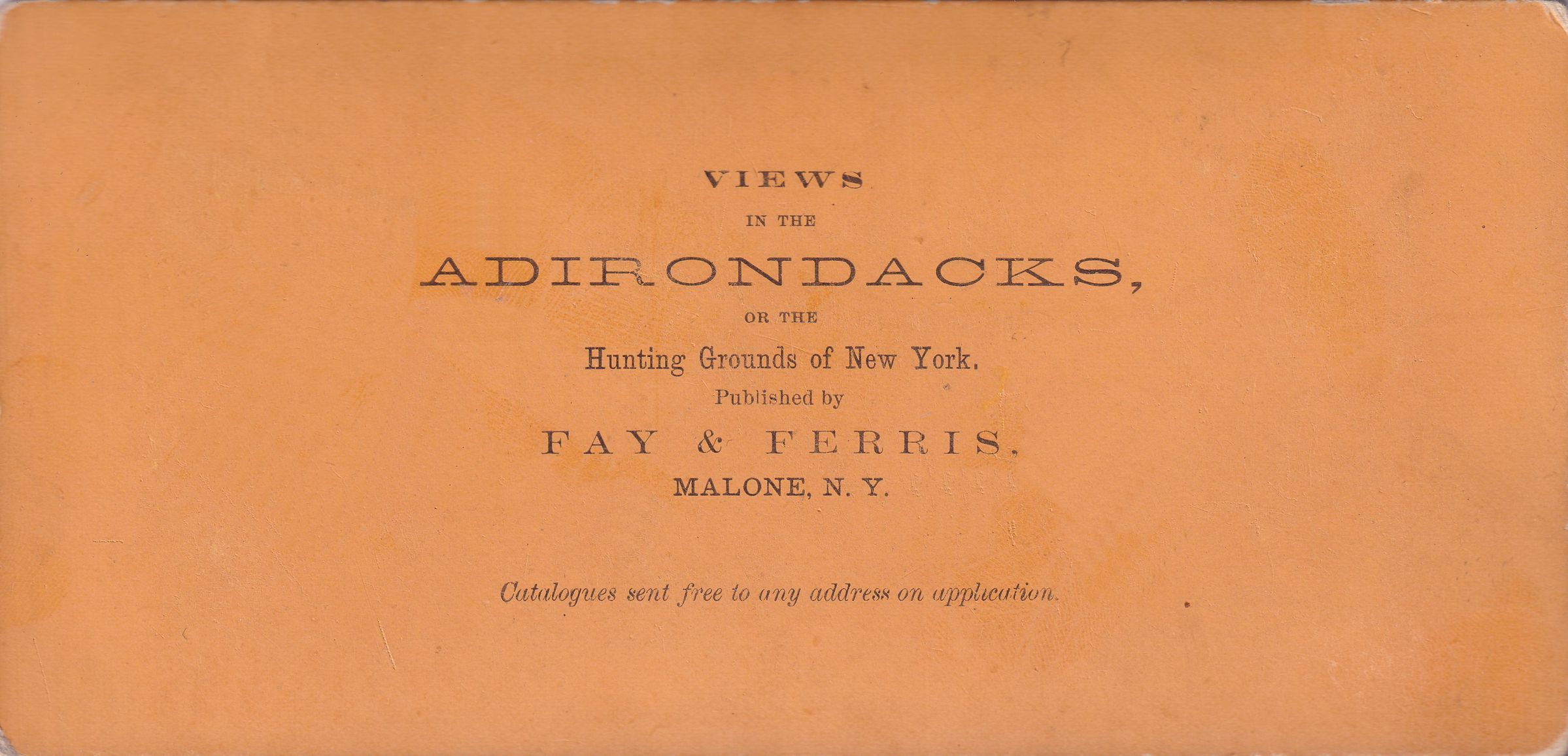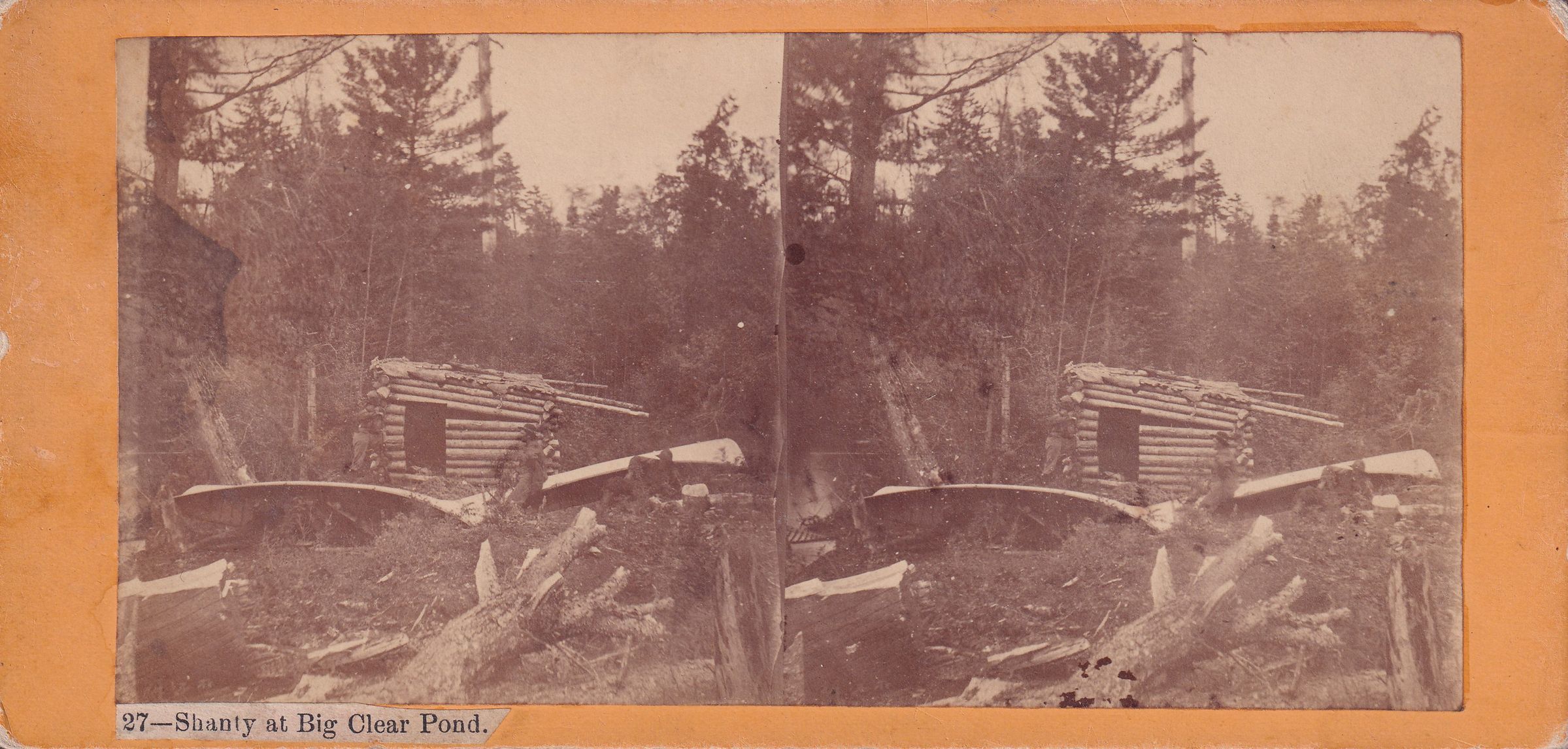 Black-and-white stereoview of a small log structure. There are two guides with guideboats in front of the building. Printed caption on image reads, "Shanty at Big Clear Pond." [Note: Big Clear Pond is now known as Lake Clear.] Mounted on yellow cardboard backing. Printed caption on back reads, "Views in the Adirondacks, or the Hunting Grounds of New York. Published by Fay & Ferris, Malone, N. Y. Catalogues sent free to any address on application."Photograph Details