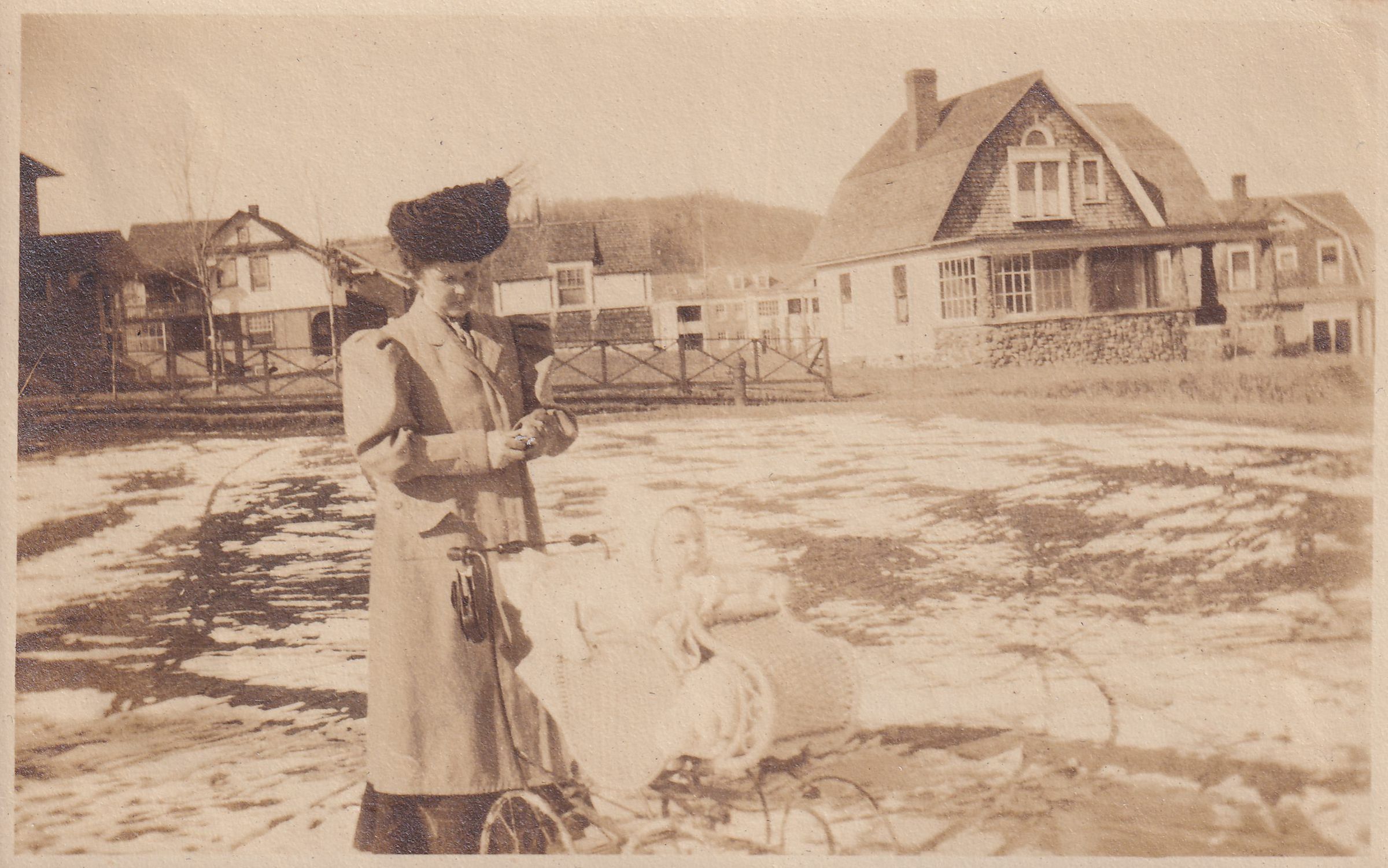 Photograph of Mary Ellen Carrier standing in an empty lot next to an infant John Dean Carrier in a wicker pram. Houses on Helen Hill (Helen Street, Franklin Avenue, and Shepard Avenue) can be seen behind them.Photograph Details