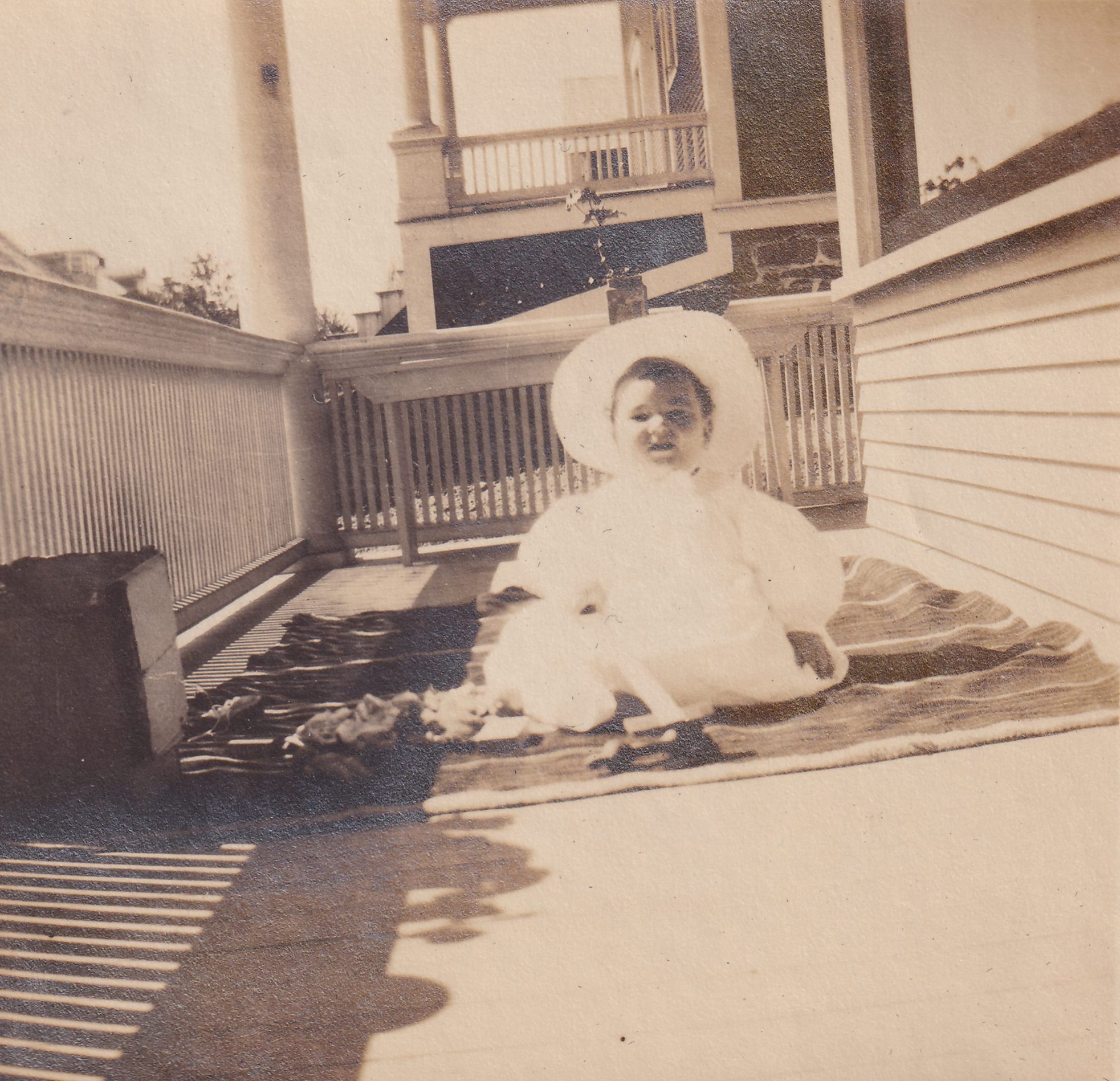 Photograph of an infant John Dean Carrier sitting on the front porch of a house, likely 33 Franklin Avenue [79]. He is seated on a blanket and wearing a floppy hat.