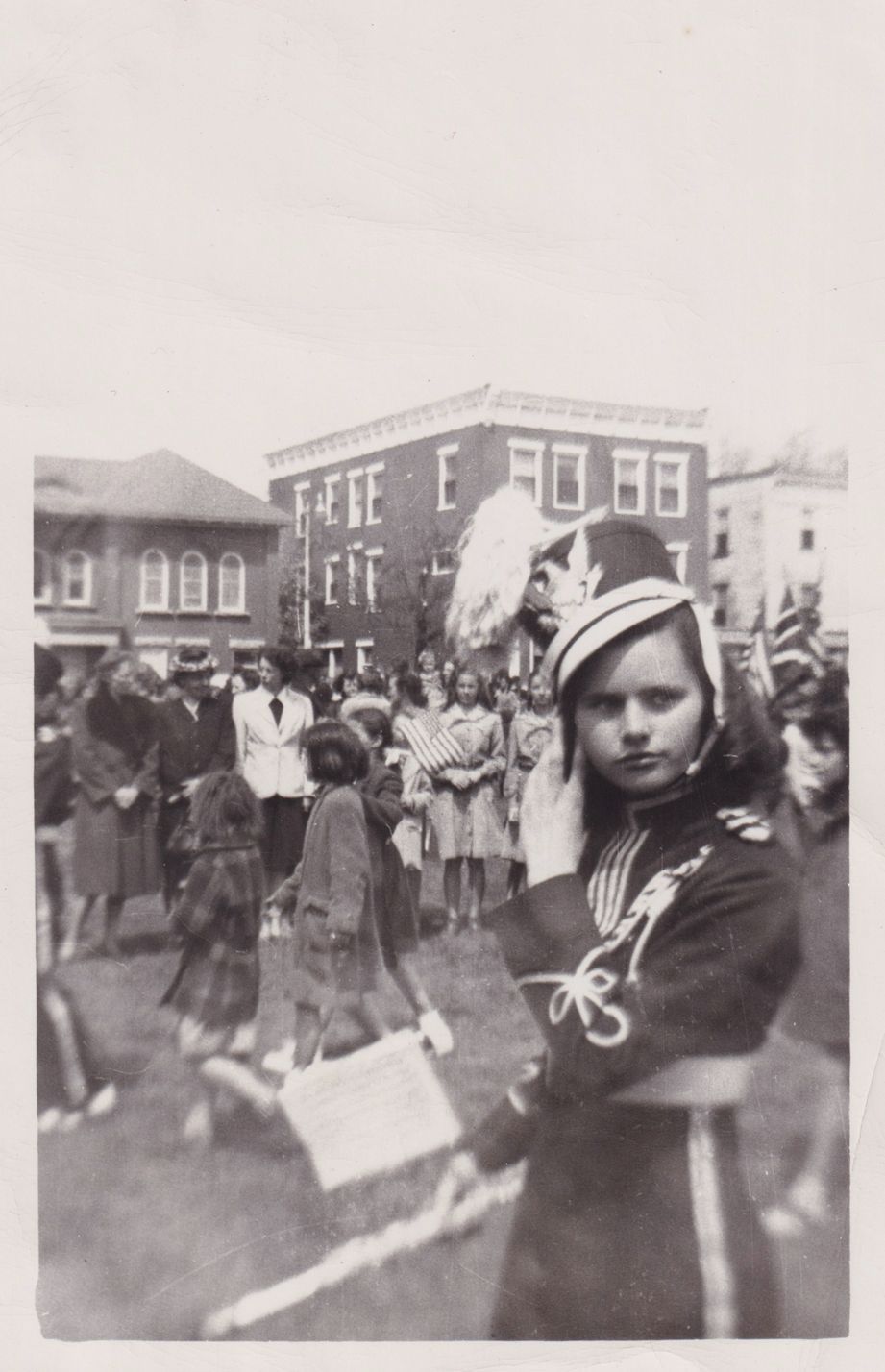 Black-and-White photograph of a girl in a marching band uniform. She is holding a flute, and standing in Riverside Park. Several buildings along Main Street are visible behind her. In another photograph [2025.22.14] she is identified as Mary Sue LaValle. Stamped “C. C. Photo” on reverse.