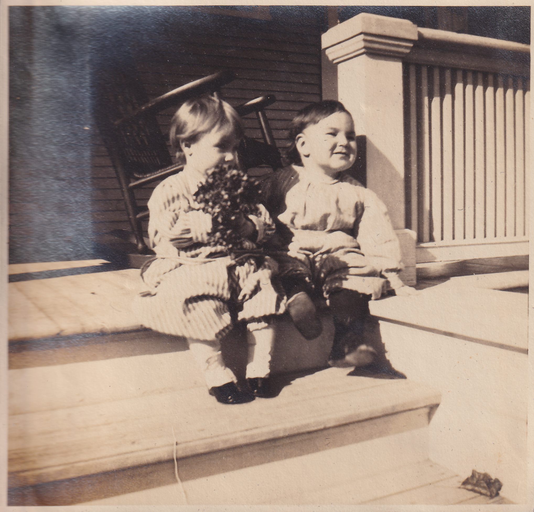 Photograph of a toddler John Dean Carrier (right) and an unidentified toddler. Both are seated at the top of the front steps of 33 Franklin Avenue (79). The child at left is holding a bunch of leaves or flowers.