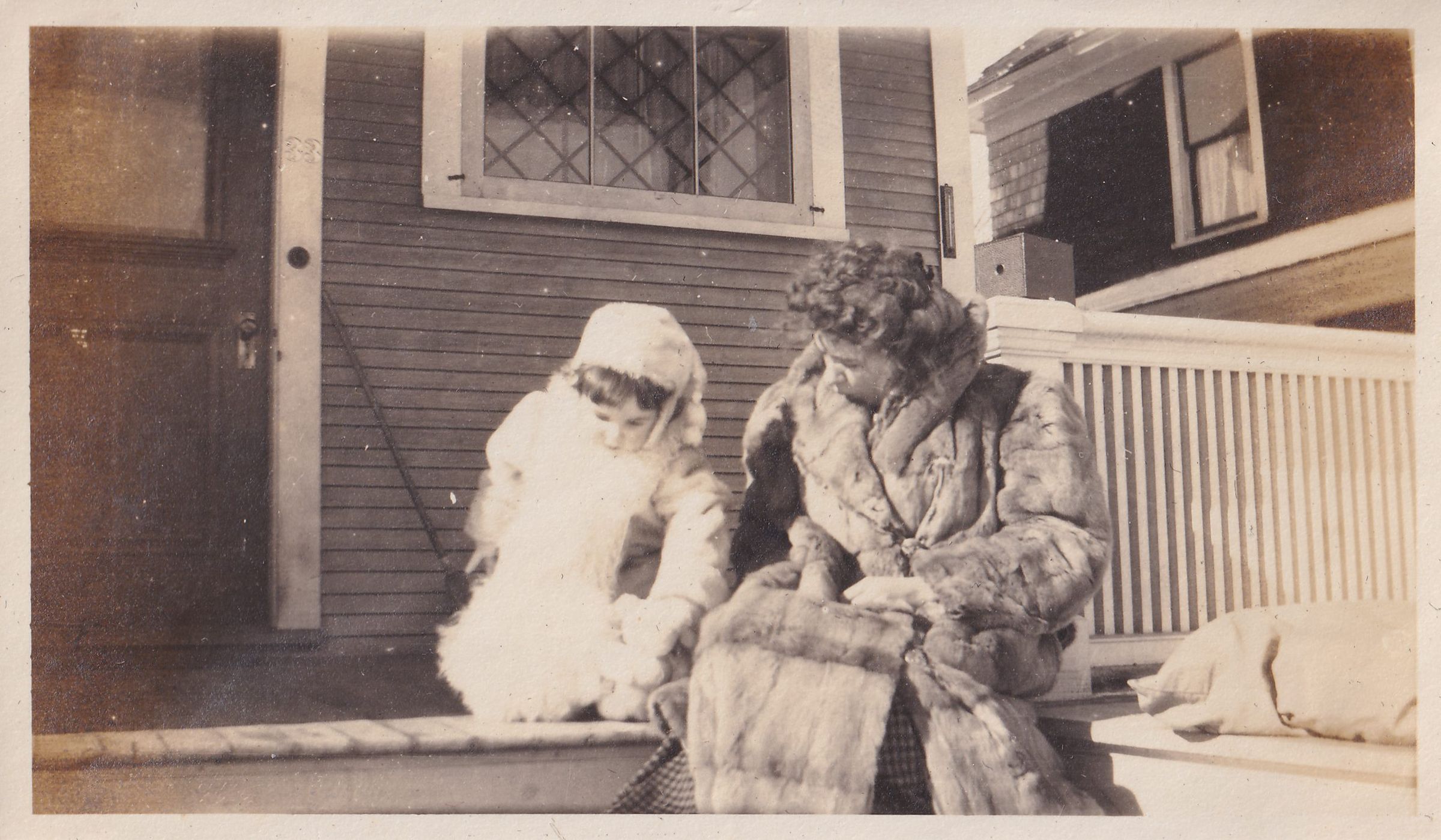 Photograph of a toddler John Dean Carrier and an unidentified woman in a fur coat, possibly Mary Ellen Carrier, sitting on the steps of 33 Franklin Avenue [79]. There is a box camera on the railing behind them.