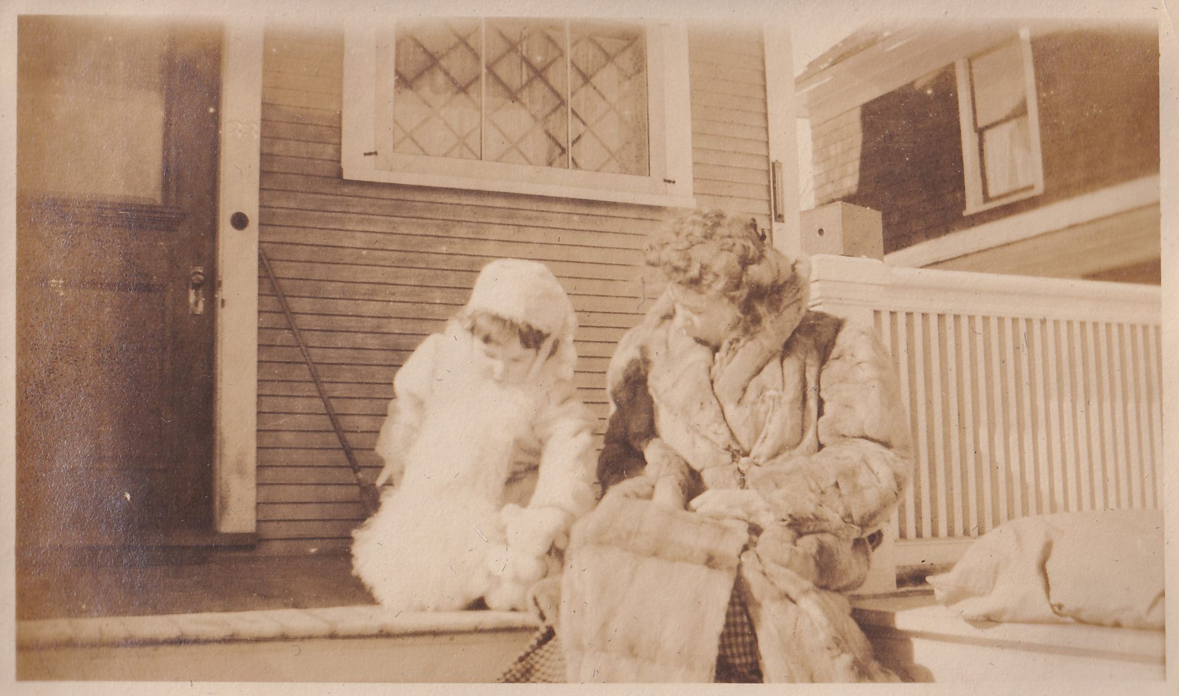 Photograph of a toddler John Dean Carrier and an unidentified woman in a fur coat, possibly Mary Ellen Carrier, sitting on the steps of 33 Franklin Avenue [79]. There is a box camera on the railing behind them.