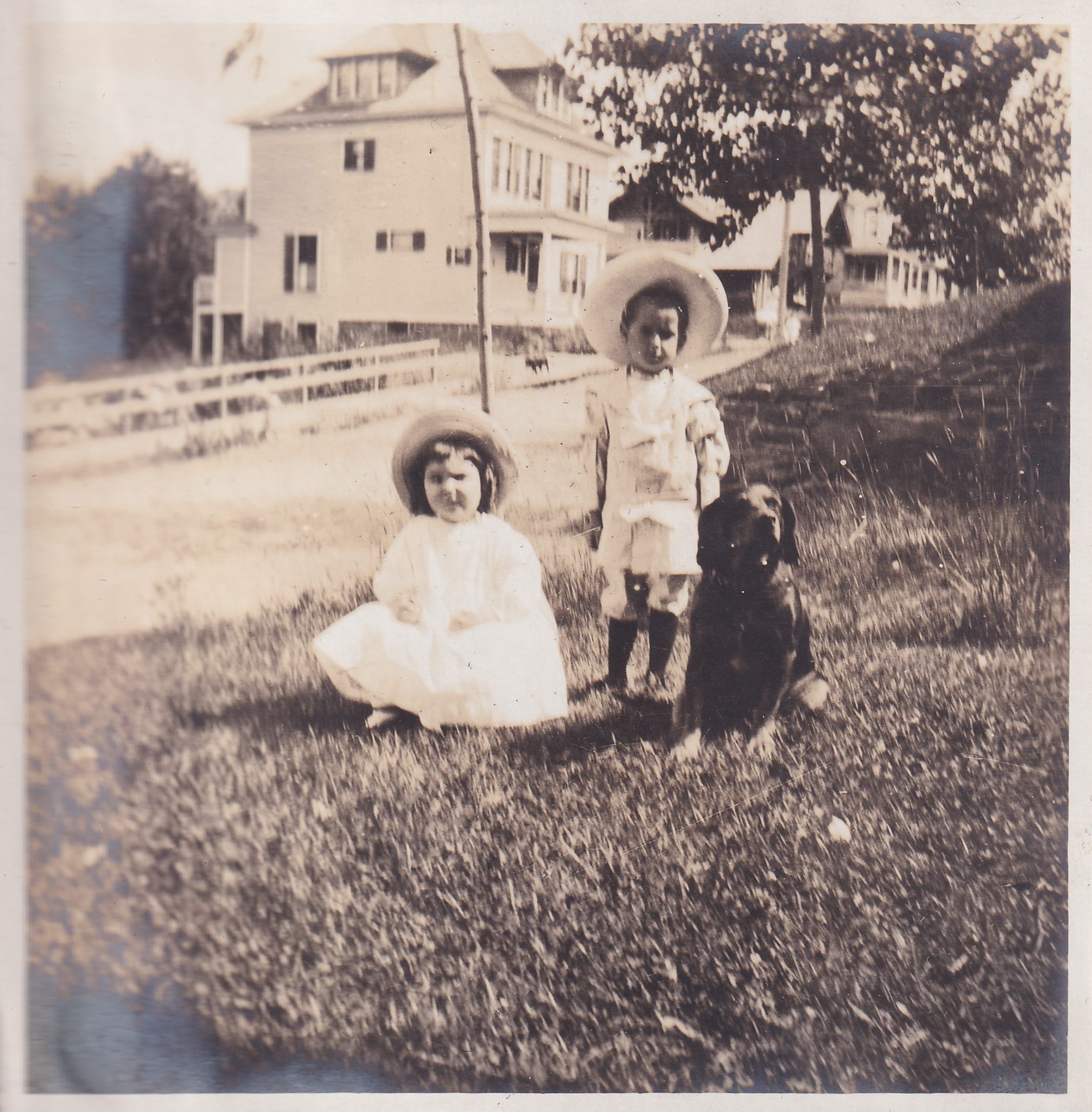 Photograph of a toddler John Dean Carrier and an unidentified child on the lawn in front of 33 Franklin Avenue [79] with a dog. Both children are wearing hats. 40 Franklin Avenue [68] can be seen across the street behind them.