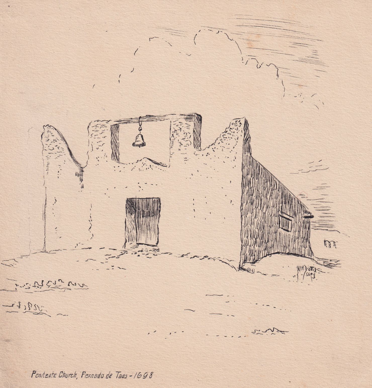 Ink drawing of an adobe building in Taos, New Mexico with a bell at the top. The caption at the bottom written in ink says "Peniteate Church, Fernado de Taos - 1698" and "H.W. Davis copy."