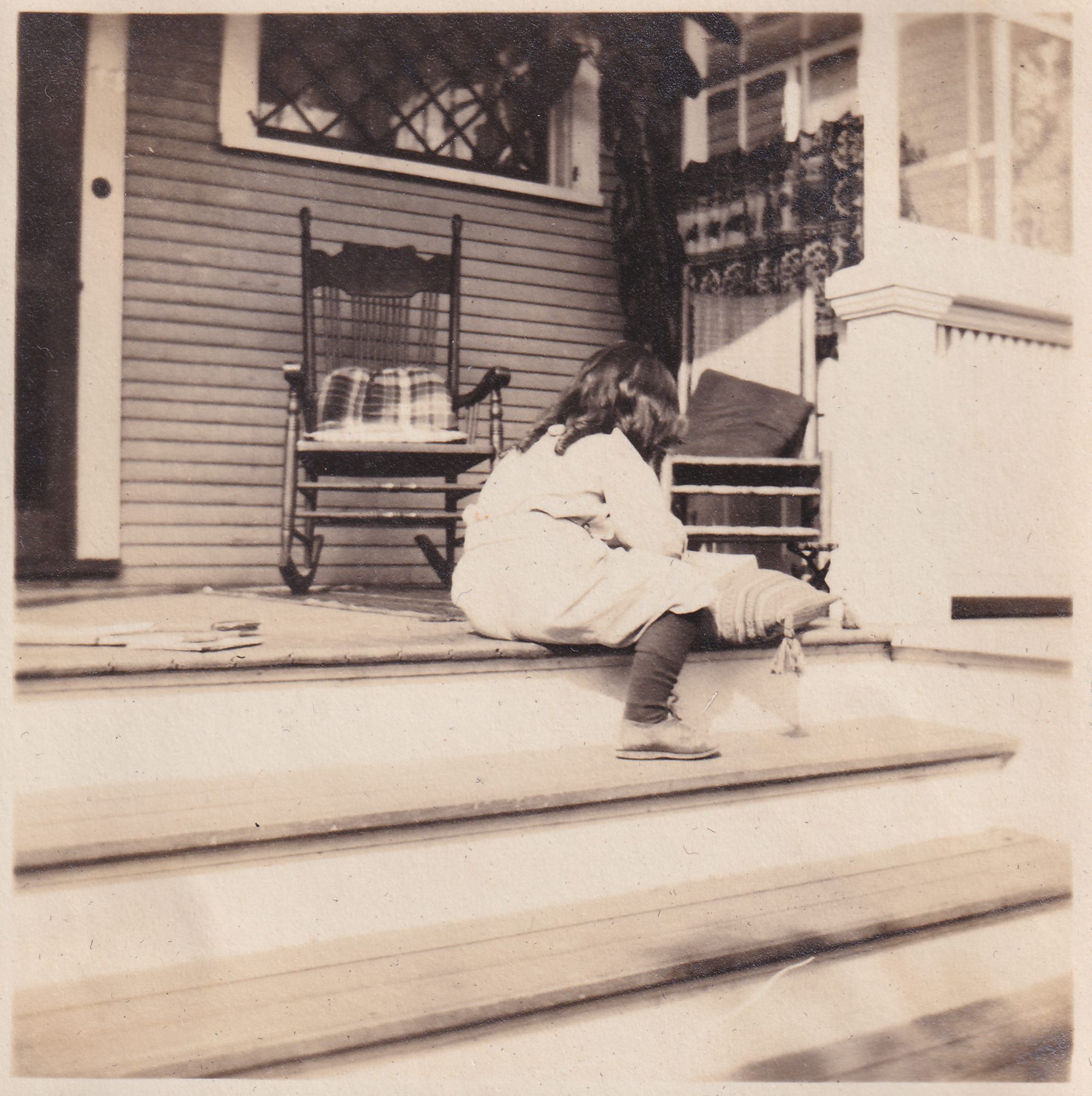 Photograph of the back of toddler John Dean Carrier on the front porch of 33 Franklin Avenue [79]. He is seated on the top step and turned toward the house leaning over a pillow.