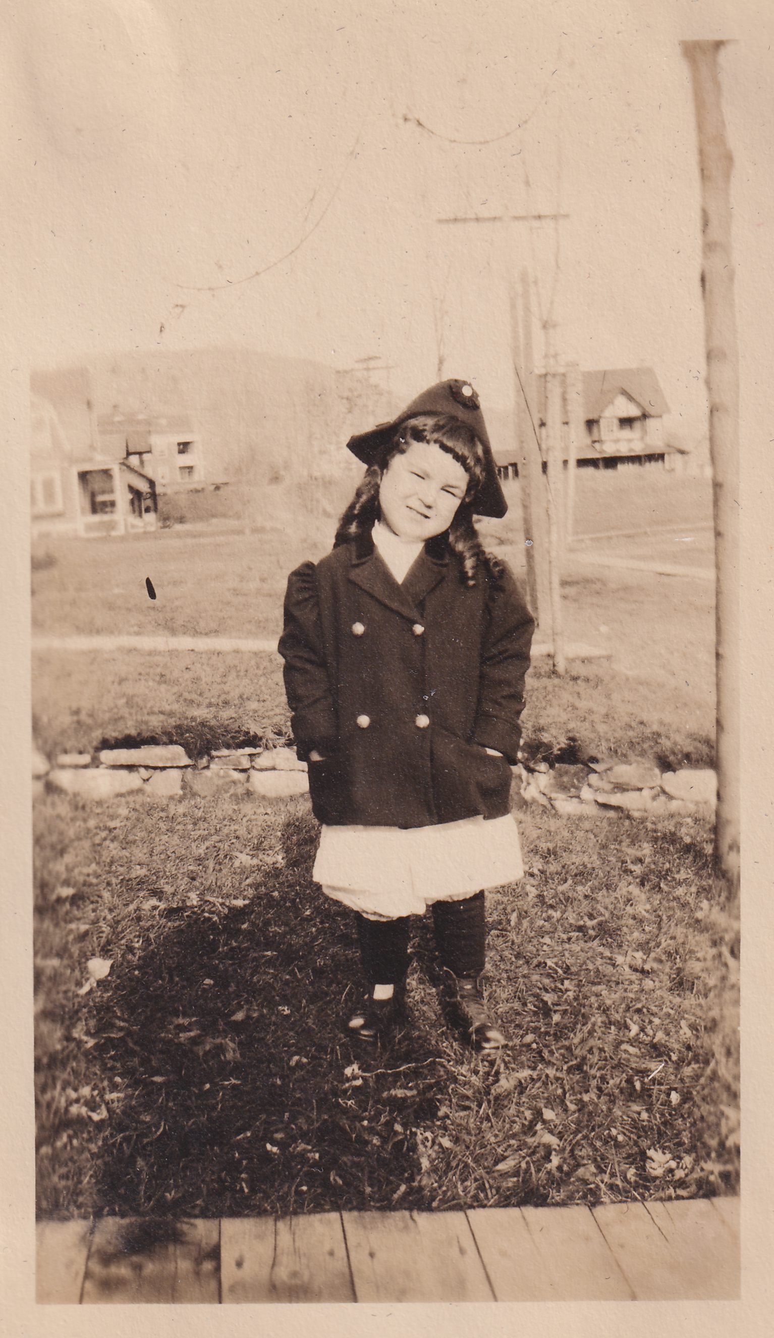 Photograph of a young John Dean Carrier standing on the front lawn of 33 Franklin Avenue [79] wearing a peacoat and a tri-corner hat. Several houses on Franklin Avenue are visible behind him, including Reception Hospital (Prescott House) and 20 Franklin Avenue [108].Photograph Details