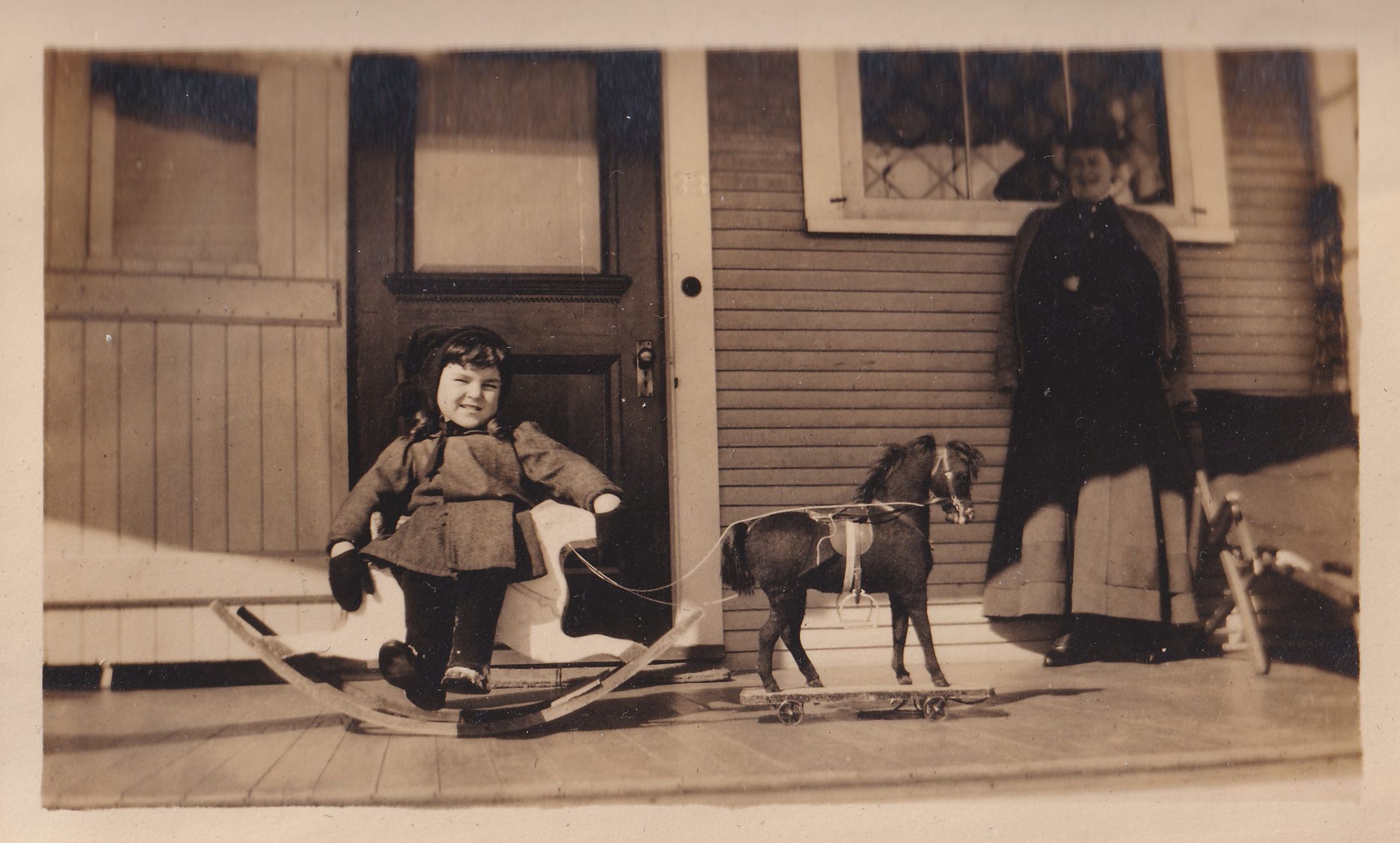 Photograph of a young John Dean Carrier seated on a rocking horse on the front porch of 33 Franklin Avenue [89]. He is holding the rope of a large toy horse on wheels. His mother Mary Ellen is standing on the porch behind him.
