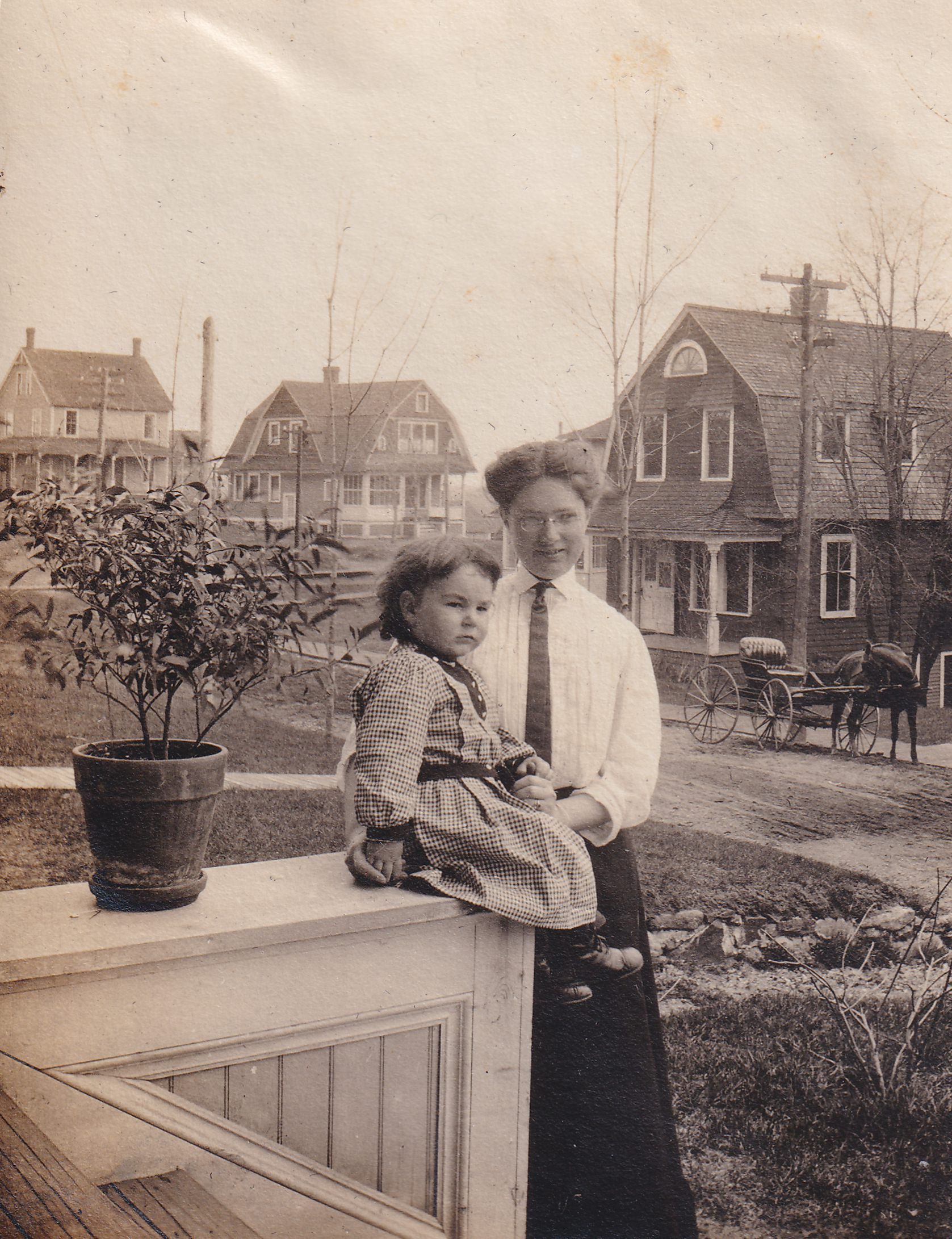 Photograph of a toddler John Dean Carrier seated on the edge of the front porch steps of 33 Franklin Avenue [79], with his half sister Blanche Smith standing next to him. There is a potted plant behind John. Houses are visible behind them, including 40 Helen Street [87] and 30 Franklin Avenue [86]. There is a horse-drawn carriage on Franklin Avenue.Photograph Details