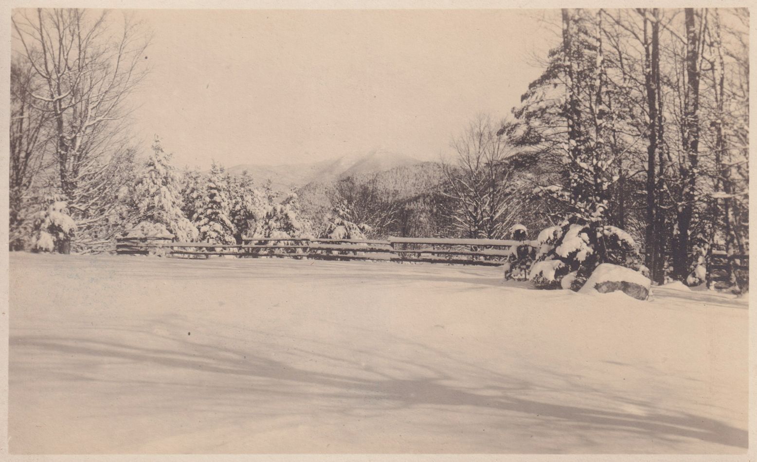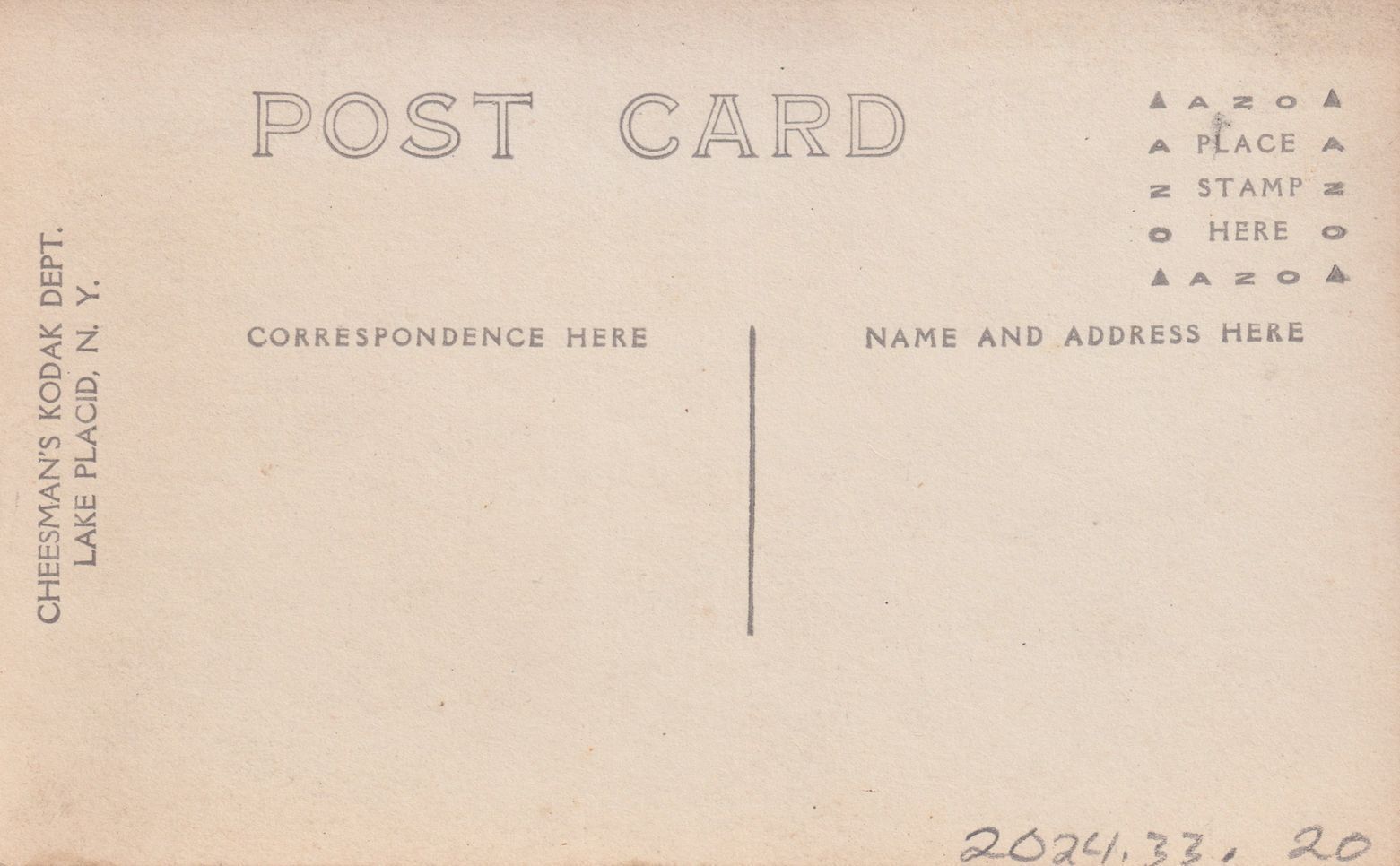 Black and white photo postcard of a snowy road with an Adirondack vista in the background. Photographed and/or published by Cheeseman's Kodak Dept. in Lake Placid, NY.