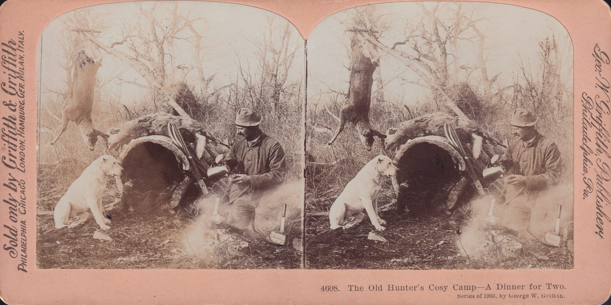 Black-and-White stereoview photograph of a hunter and his dog at camp in a hollow log. Several deer carcasses are visible behind them. Printed caption on backing reads, "The Old Hunter's Cosy Camp - a Dinner for Two." The location of this photograph is unknown. Published by Geo. W. Griffith, Philadelphia. Mounted on tan cardboard backing.