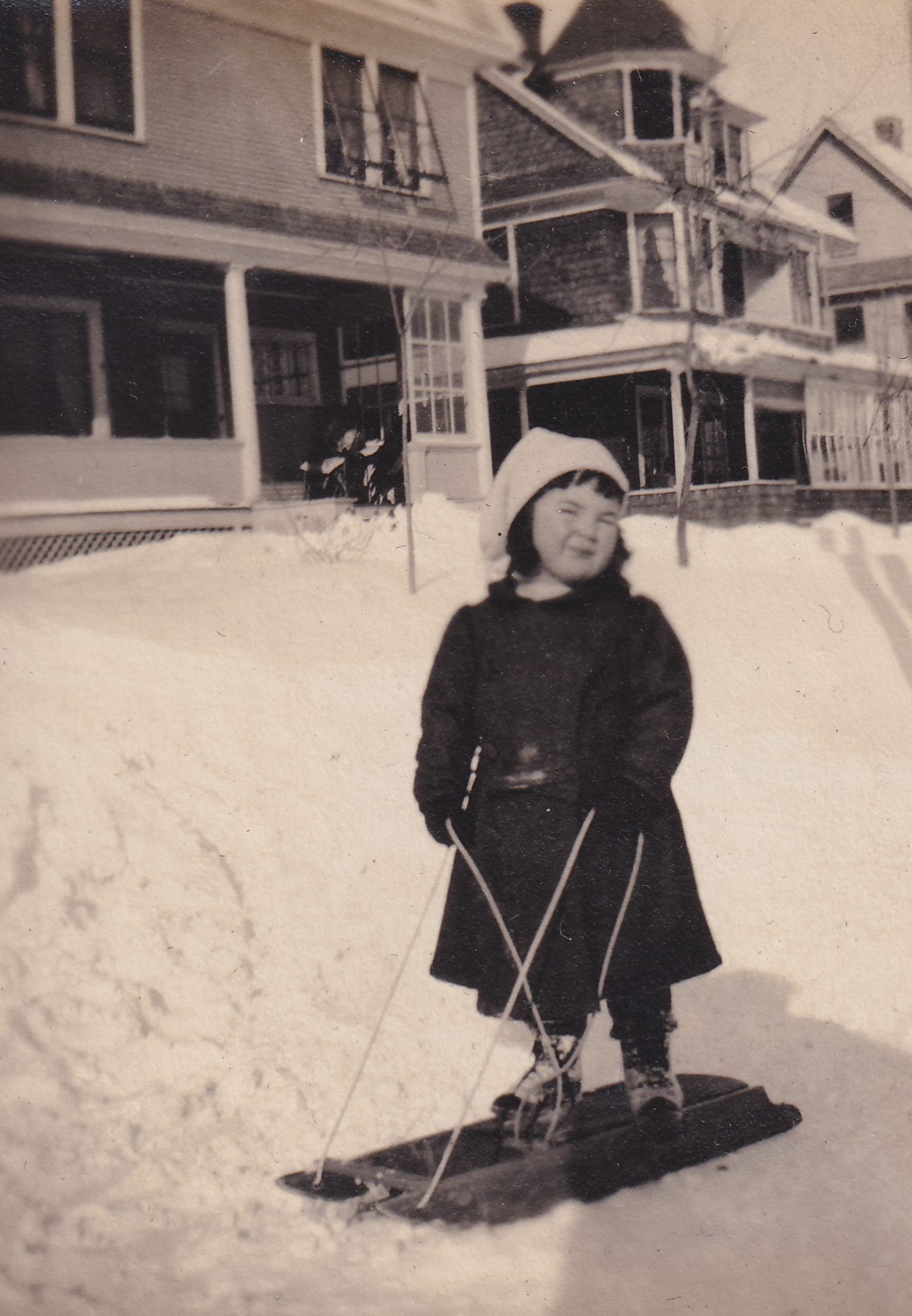Photograph of a young John Dean Carrier standing on a wooden sled in the snow in front of 33 Franklin Avenue [79]. 31 Franklin Avenue [83] is visible behind him.