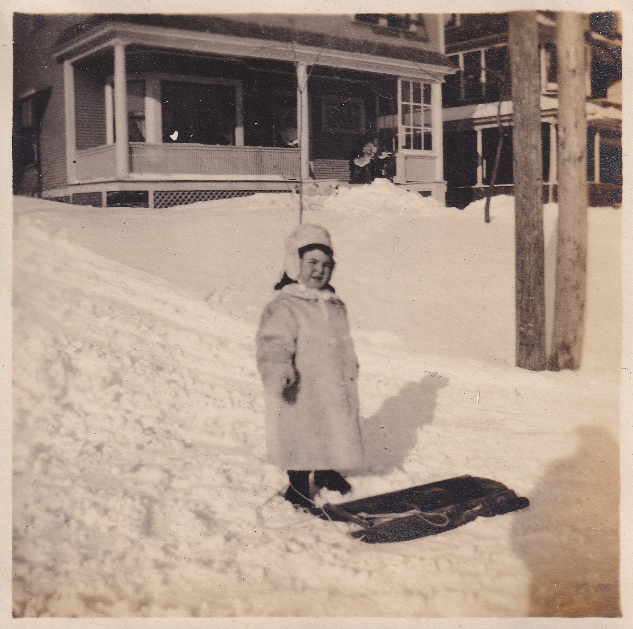 Photograph of a young John Dean Carrier standing in the snow with a wooden sled in front of 33 Franklin Avenue [79]. He is wearing a winter coat and hat.