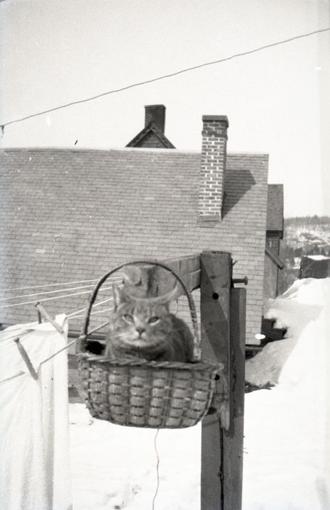 Negative of a cat in a basket. The handle of the basket has been placed over a bit of wood holding a clothesline to hold the basket in the air. The roof of the house next door can be seen in the background. Most likely taken by Mary Ives Baldwin. This item is not fully cataloged but has been uploaded so the image is publicly available; if you would like us to prioritize cataloging this item, please contact the HSL Collections team.