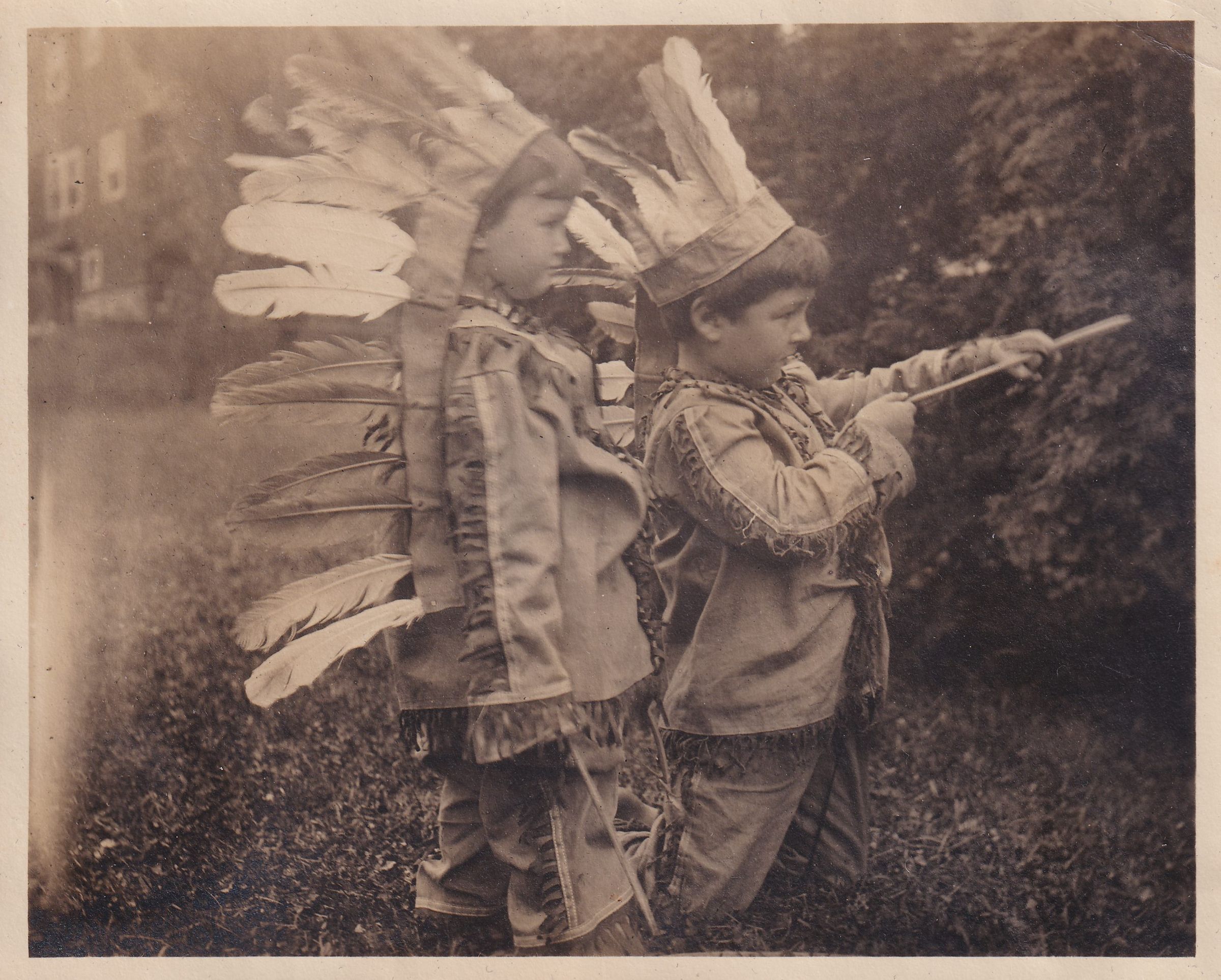 Photograph of a young John Dean Carrier (right) and another unidentified child dressed in homemade Native American costumes and standing in profile. John is kneeling and holding an arrow.Photograph Details