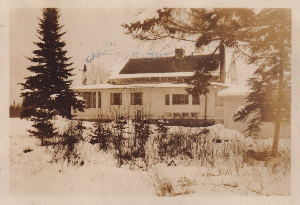 Black-and-White photograph of Danforth Cottage in the snow, seen from the side. Part of album 2024.21.1, kept by Amy Jones and David Blair Jones c. 1930-1934.