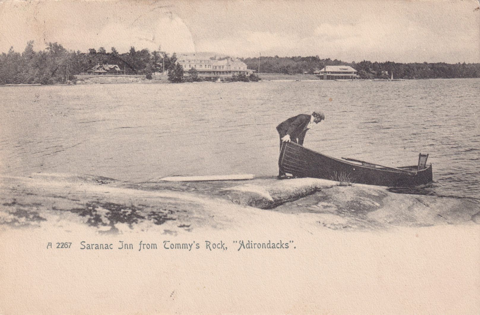 Black-and-White postcard showing a man standing on a large rock and leaning over to push a guideboat into a body of water. The Saranac Inn campus can be seen on the far side of the lake. Printed caption on front reads, "Saranac Inn from Tommy's Rock, 'Adirondacks'." Printed by the Rotograph Co., N.Y. City. Used, divided back, white space at bottom front for message, postmarked Elmo, MO, July 26, 1910. Handwritten message on back reads, "Was so glad to hear from you. Hope you've had your clothes on by this time. How did Uncle like that care. Answer soon love to all, Mary [?]." Mailed to Mrs. Chas. Gay, Janesville, MN.Subject Place