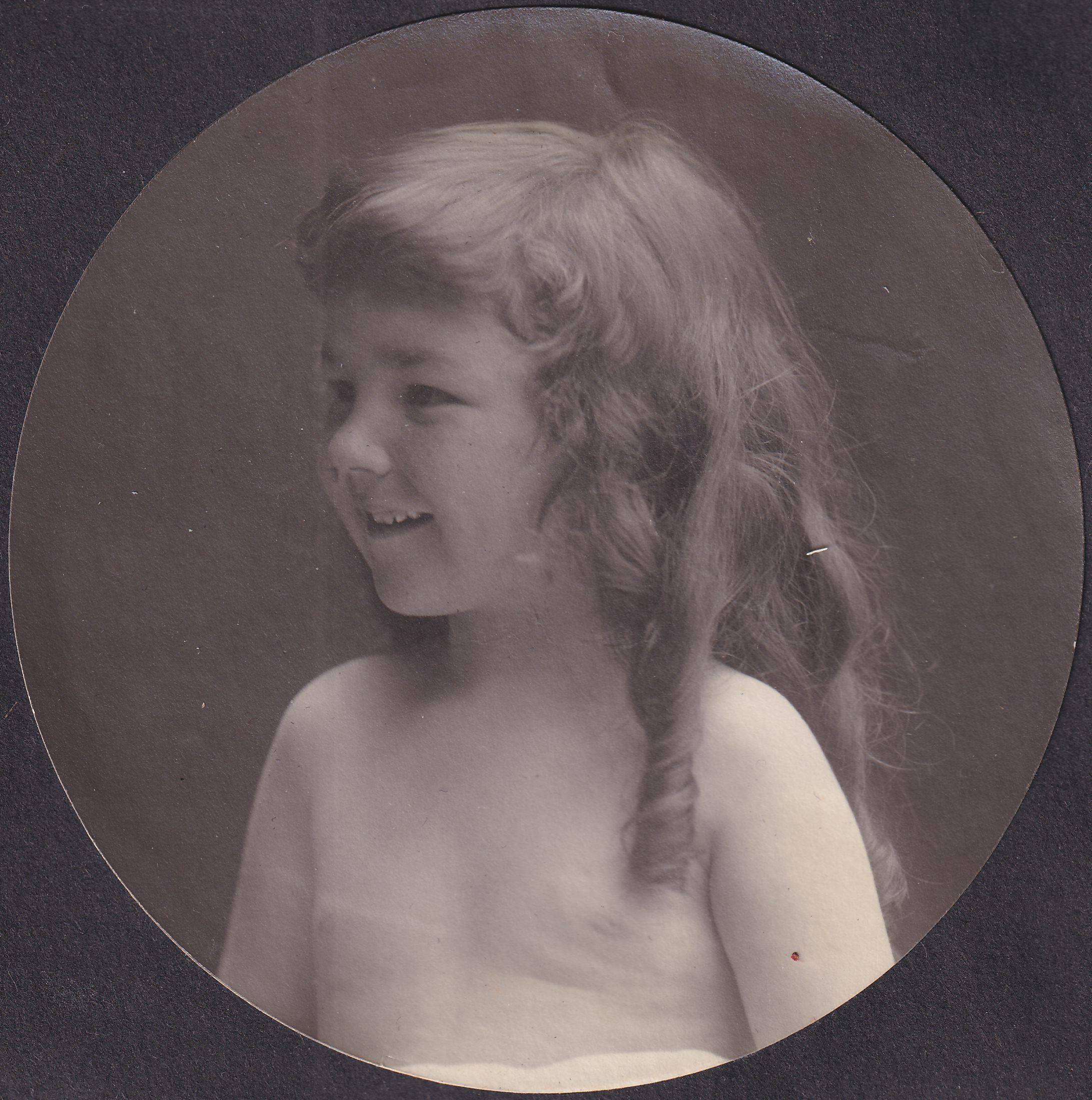Circular sudio photograph of John Dean Carrier about age four. He has long, curly dark hair and is shirtless. He is sitting in front of a black backdrop and photographed from mid-torso up.